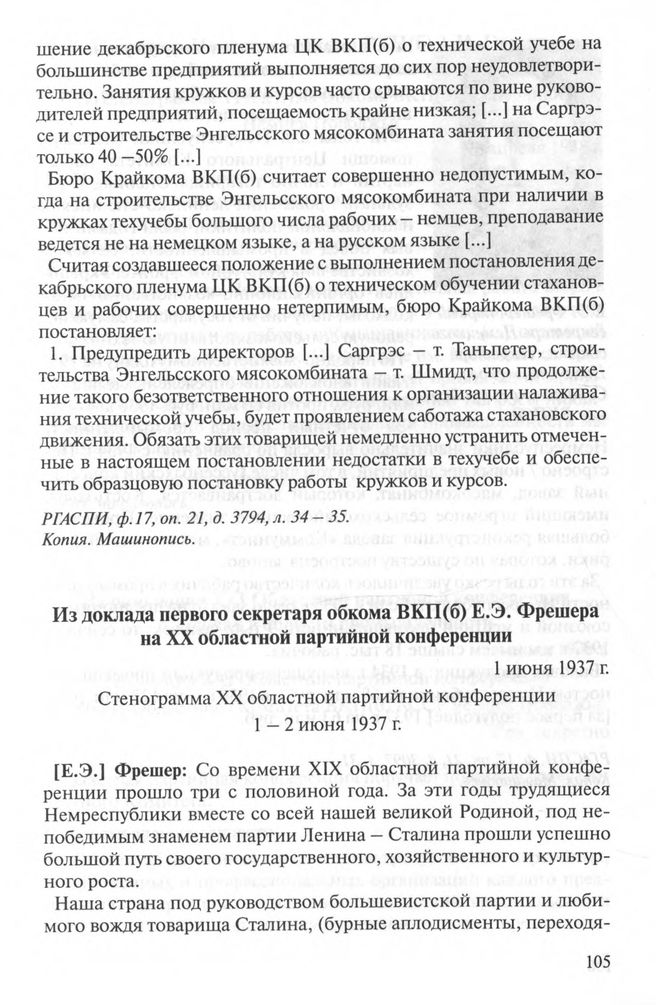 Из доклада первого секретаря обкома ВКП(б) АССР НП Е. Э. Фрешера на XX областной партийной конференции. 1 июня 1937 г. Стенограмма XX областной партийной конференции. 1 - 2 июня 1937 г. // РГАСПИ. Ф. 17. Оп. 21. Д. 3097. Л. 31. Копия. Машинопись.