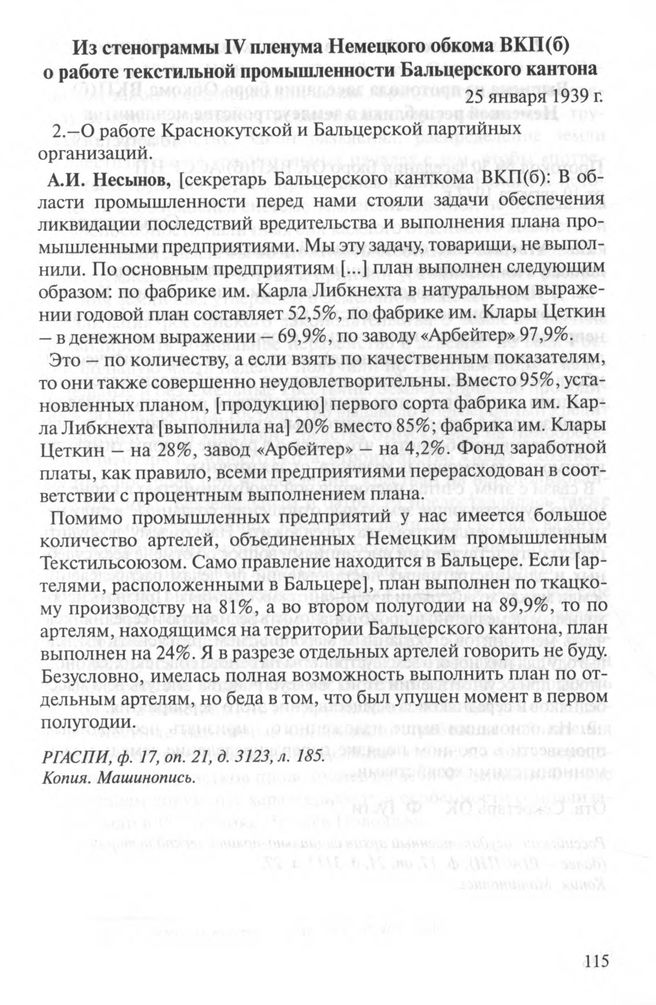 Из стенограммы IV пленума Немецкого обкома ВКП(б) о работе текстильной промышленности Бальцерского кантона. 25 января 1939 г. // РГАСПИ. Ф. 17. Оп. 21. Д. 3123. Л. 185. Копия. Машинопись.