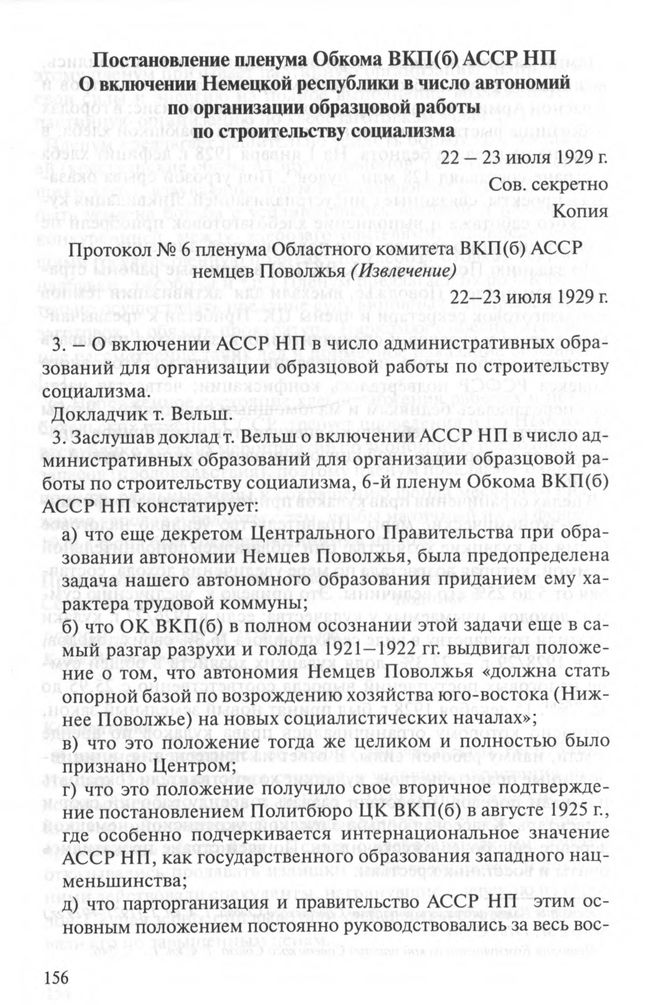 Постановление пленума Обкома ВКП(б) АССР НП О включении Немецкой республики в число автономий по организации образцовой работы по строительству социализма. 22-23 июля 1929 г. // РГАСПИ. Ф. 17. Оп. 21. Д. 3114. Л. 35 - 36. Копия. Машинопись.