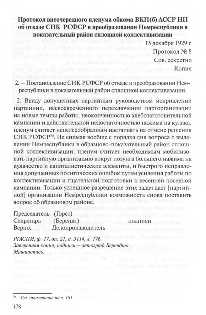 Протокол внеочередного пленума обкома ВКП(б) АССР НП об отказе СНК РСФСР в преобразовании Немреспублики в показательный район сплошной коллективизации. 15 декабря 1929 г. // РГАСПИ. Ф. 17. Оп. 21. Д. 3114. Л. 176. Заверенная копия, подпись-автограф Берендта. Машинопись.