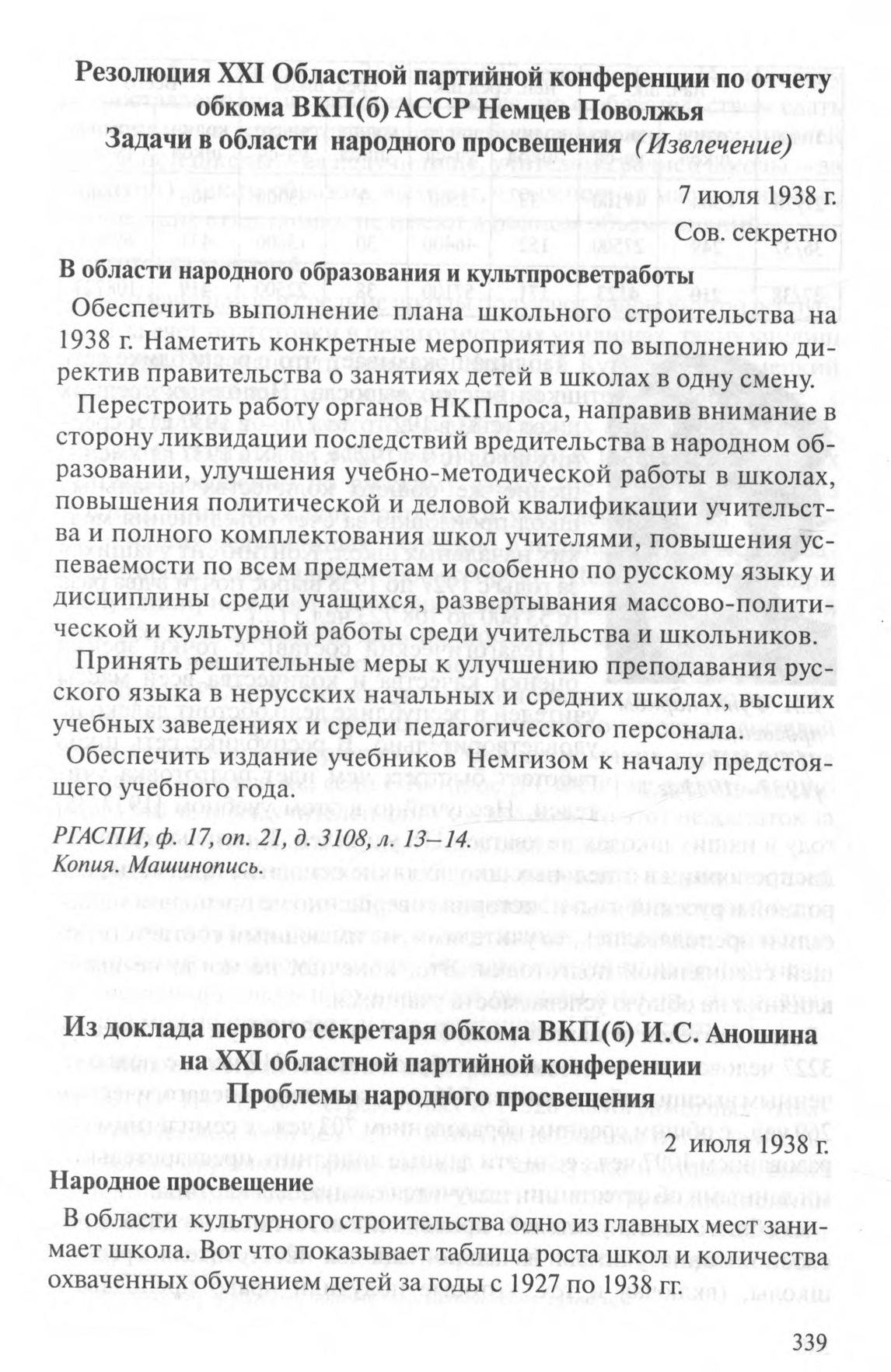 Из доклада первого секретаря обкома ВКП(б) АССР НП И. С. Аношина на XXI областной партийной конференции. Проблемы народного просвещения. 2 июля 1938 г. // РГАСПИ. Ф. 17. Оп. 21. Д. 3108. Л. 139, 145-147, 151. Копия. Машинопись.