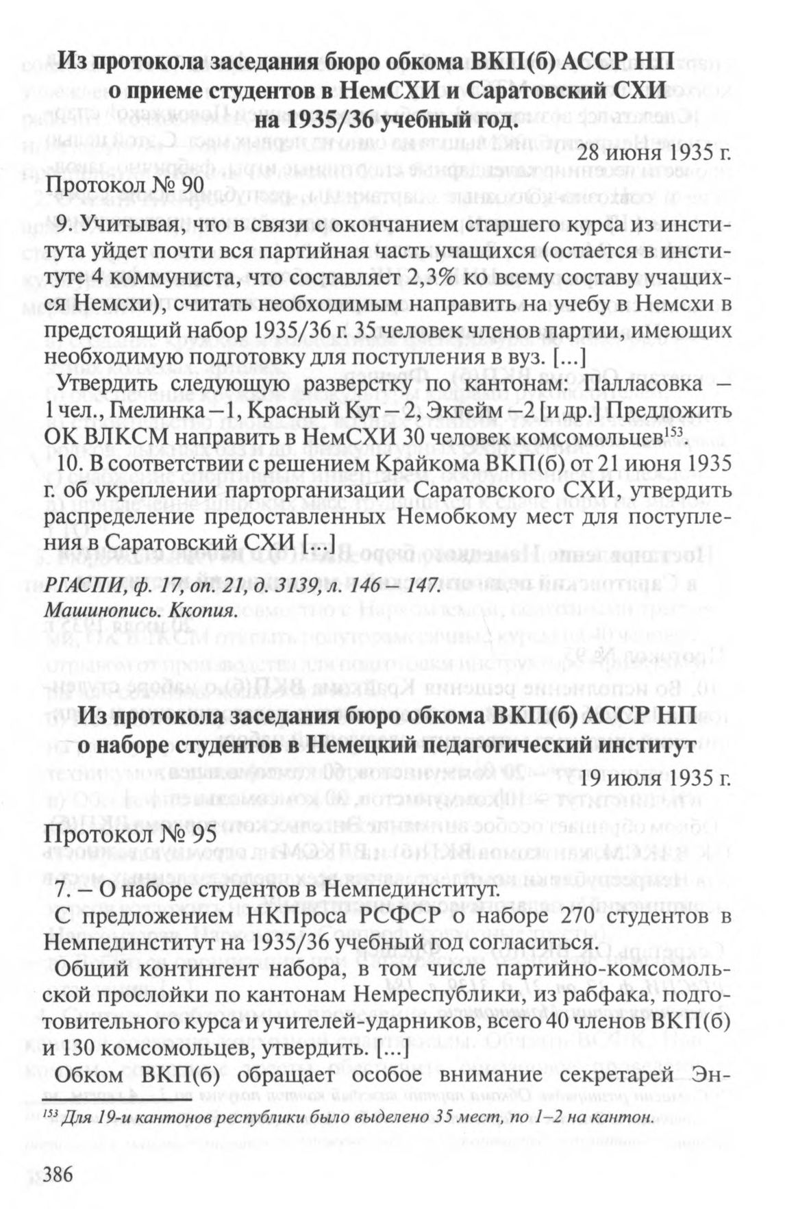 Из протокола заседания бюро обкома ВКП(б) АССР НП о приеме студентов в НемСХИ и Саратовский СХИ на 1935/36 учебный год. 28 июня 1935 г. // РГАСПИ. Ф. 17. Оп. 21. Д. 3139. Л. 146-147. Машинопись. Копия.