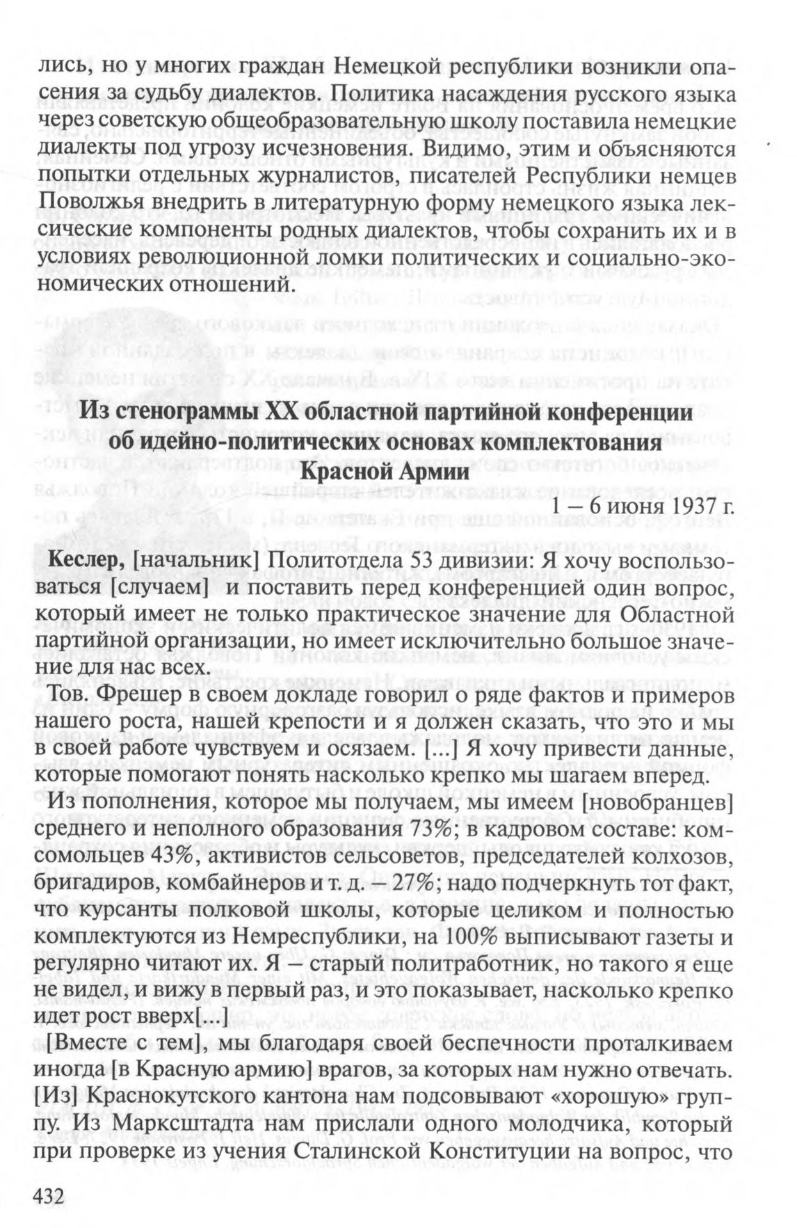 Из стенограммы XX областной партийной конференции об идейно-политических основах комплектования Красной Армии. 1-6 июня 1937 г.