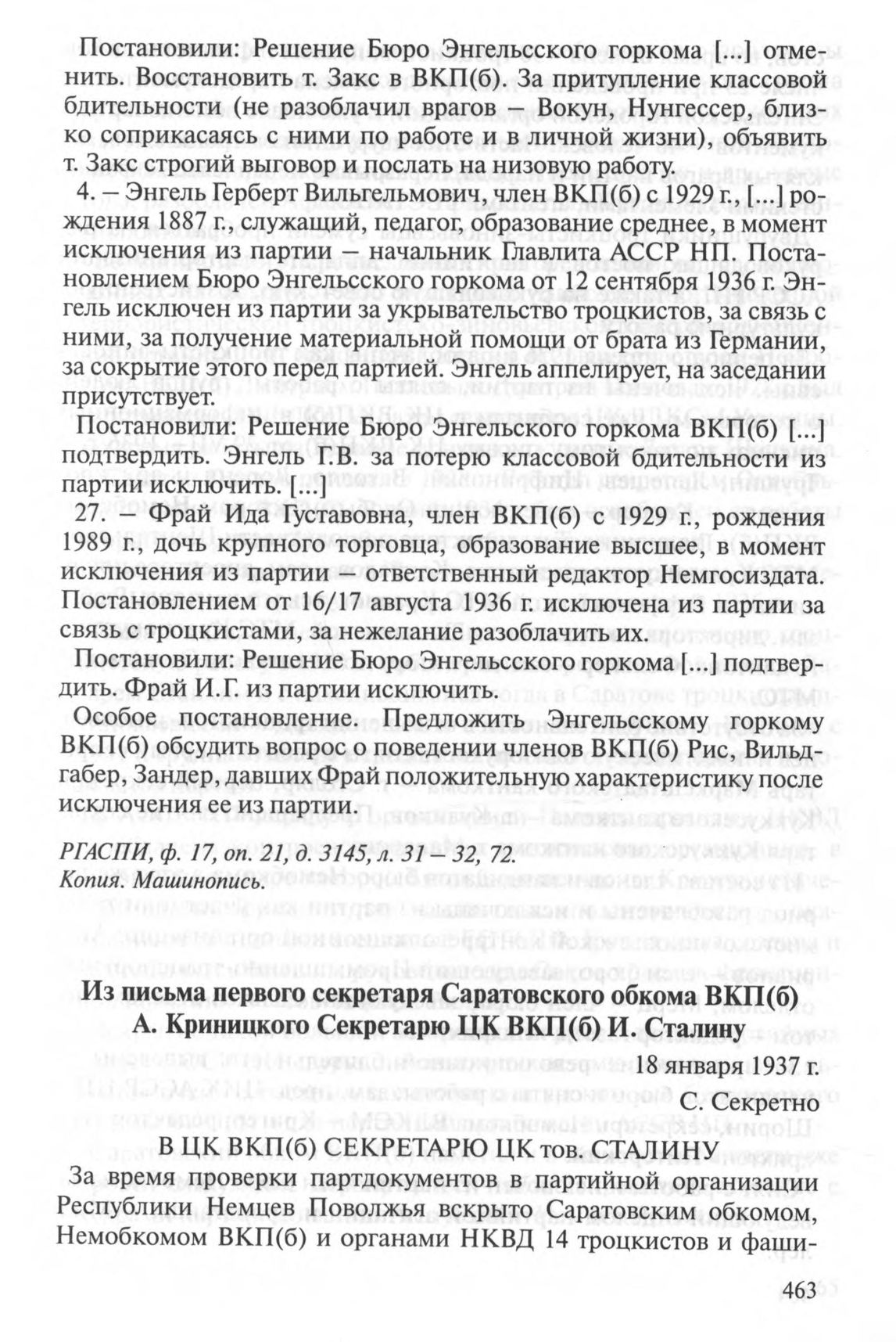 Из письма первого секретаря Саратовского обкома ВКП(б) А. Криницкого Секретарю ЦК ВКП(б) И. Сталину. 18 января 1937 г. // РГАСПИ. Ф. 17. Оп. 120. Д. 290. Л. 1-8. Копия. Машинопись.