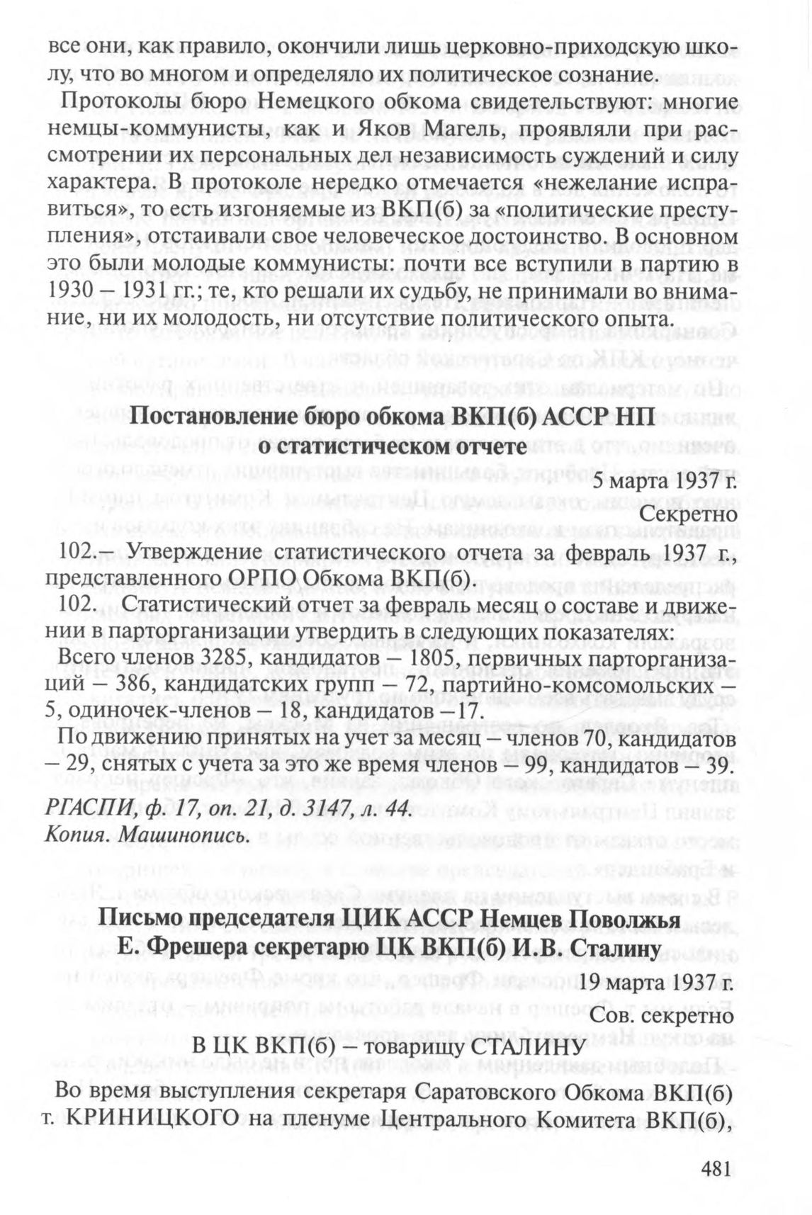 Письмо председателя ЦИК АССР Немцев Поволжья Е. Фрешера секретарю ЦК ВКП(б) И. В. Сталину. 19 марта 1937 г. // РГАСПИ. Ф. 17. Оп. 120. Д. 290. Л. 11-16. Подлинник. Подпись - автограф Е. Фрешера. Машинопись.