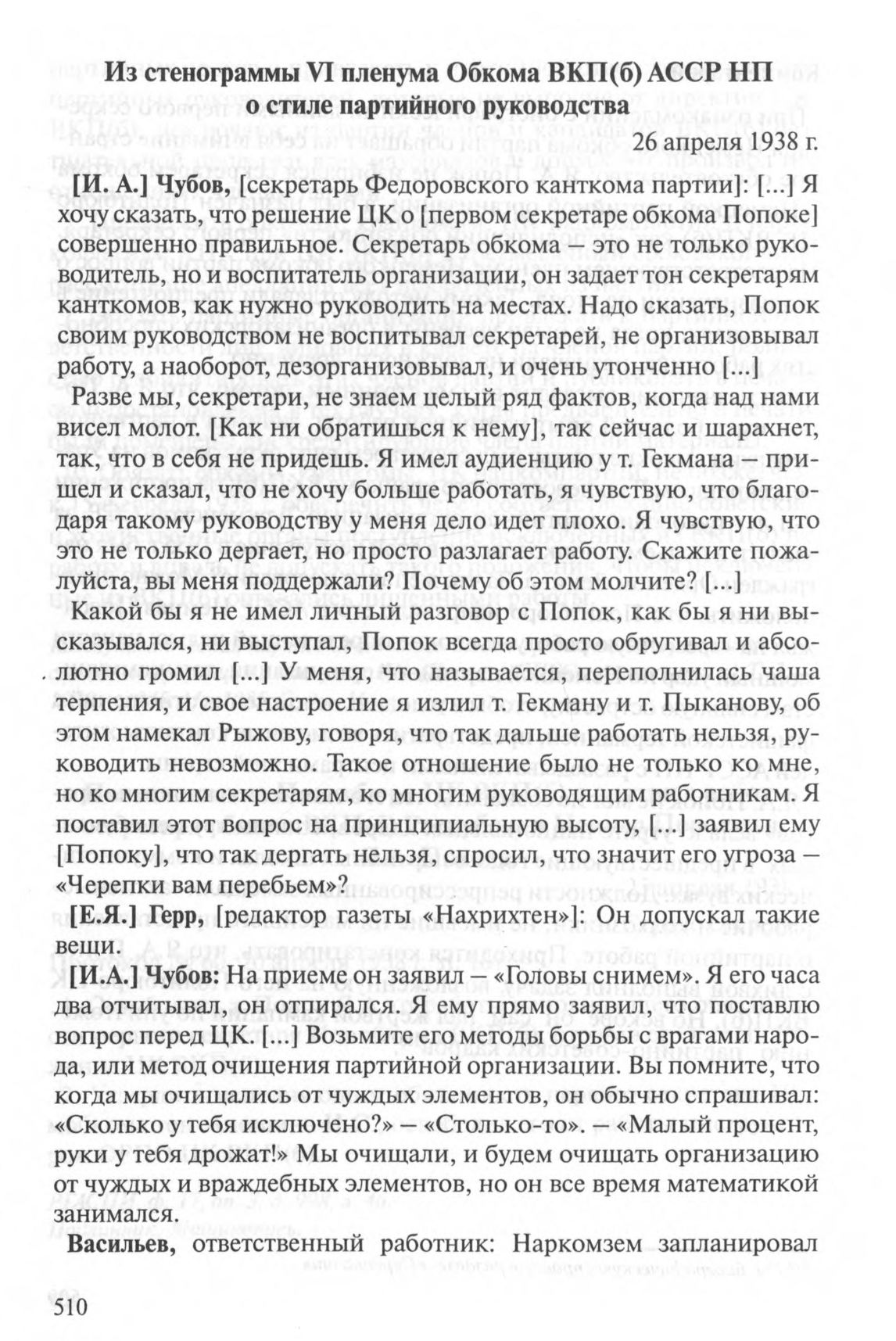 Из стенограммы VI пленума Обкома ВКП(б) АССР НП о стиле партийного руководства. 26 апреля 1938 г. // РГАСПИ. Ф. 17. Оп. 21. Д. 3121. Л. 18-20, 47, 50-54, 69, 84-85, 111, 116, 153. Копия. Машинопись.