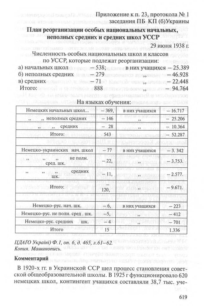 План реорганизации особых национальных начальных, неполных средних и средних школ УССР. 29 июня 1938 г. // ЦДАГО Украiнi. Ф. 1. Оп. 6. Д. 465. Л.61-62. Копия. Машинопись.