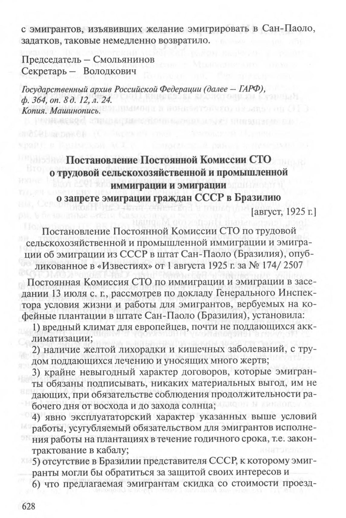 Постановление Постоянной Комиссии СТО о трудовой сельскохозяйственной и промышленной иммиграции и эмиграции о запрете эмиграции граждан СССР в Бразилию. Август, 1925 г. // ГА РФ. Ф. 364. Оп. 8. Д. 12. Л. 23-23об. Копия. Машинопись.