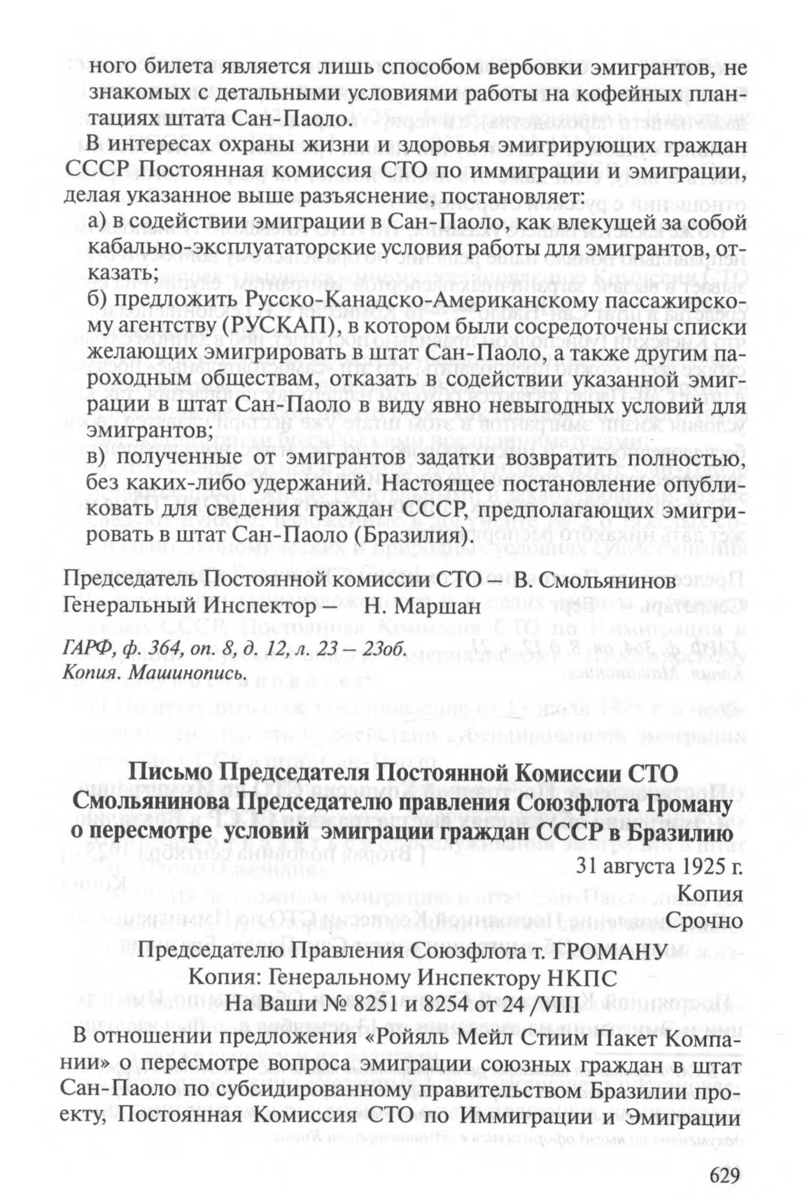 Письмо Председателя Постоянной Комиссии Совета Труда и Обороны Смольянинова Председателю правления Союзфлота Громану о пересмотре условий эмиграции граждан СССР в Бразилию. 31 августа 1925 г. // ГА РФ. Ф. 364. Оп. 8. Д. 12. Л. 21. Копия. Машинопись.