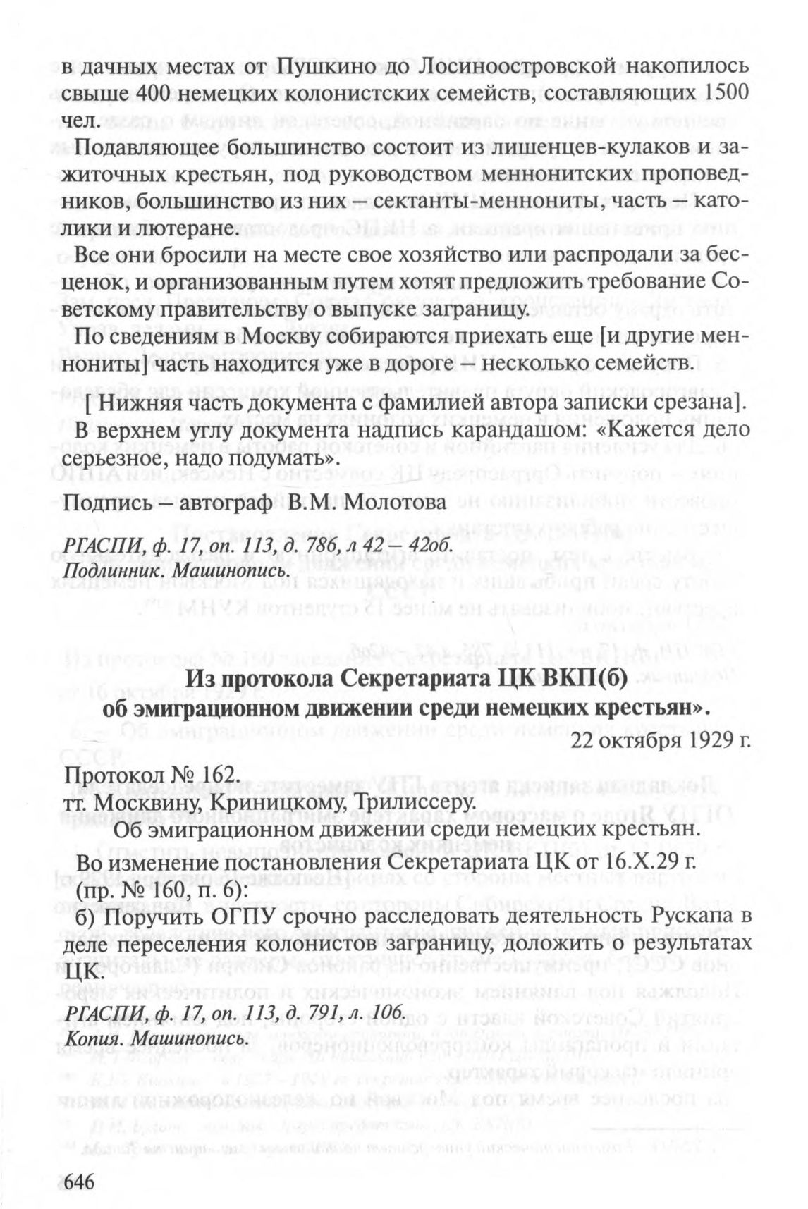 Из протокола Секретариата ЦК ВКП(б) об эмиграционном движении среди немецких крестьян. 22 октября 1929 г. // РГАСПИ. Ф. 17. Оп. 113. Д. 791. Л. 106. Копия. Машинопись.
