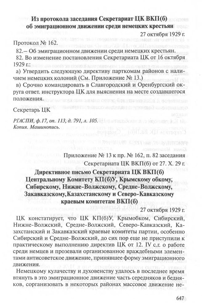 Из протокола заседания Секретариата ЦК ВКП(б) об эмиграционном движении среди немецких крестьян. 27 октября 1929 г. // РГАСПИ. Ф. 17. Оп. 113. Д. 791. Л. 105. Копия. Машинопись.