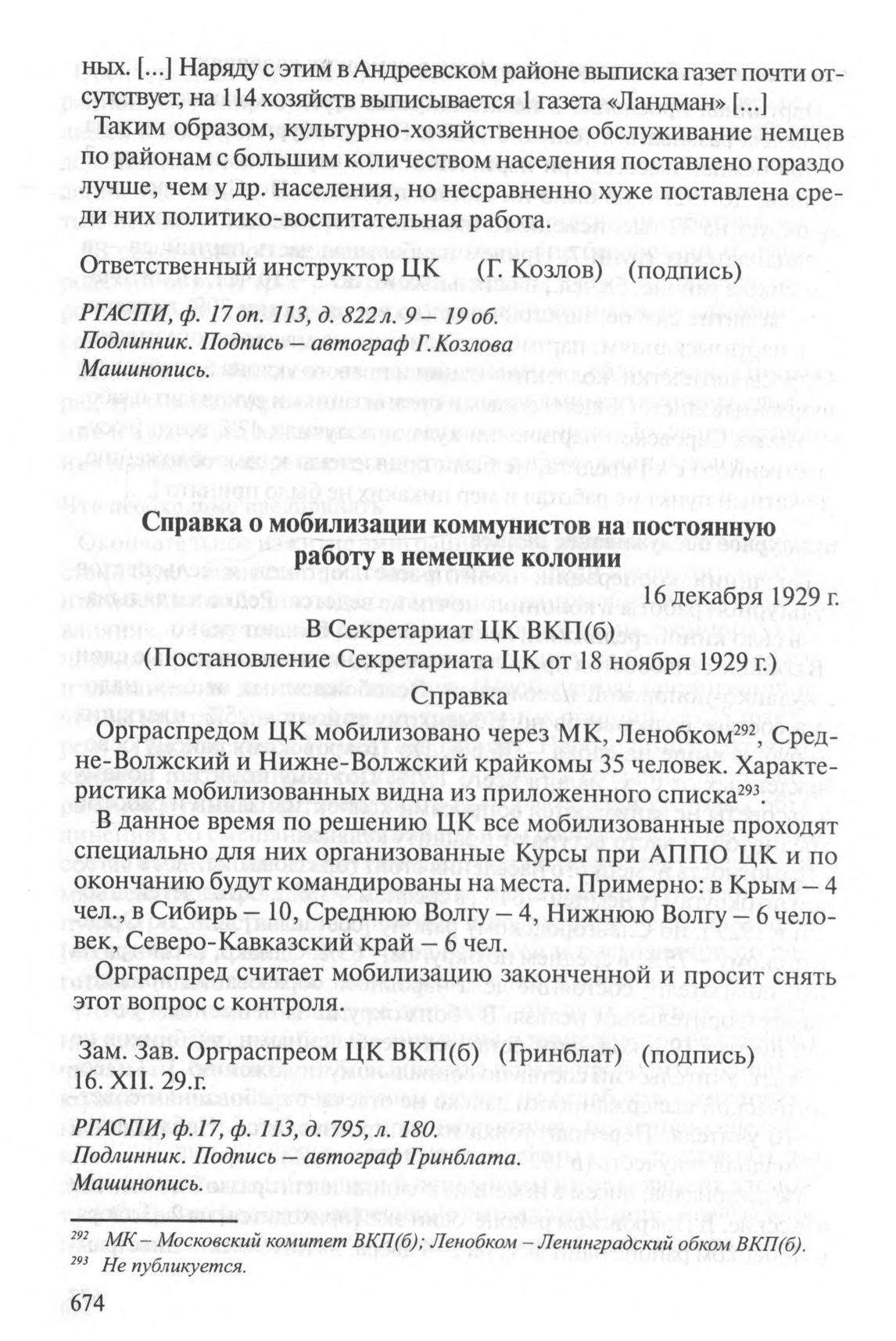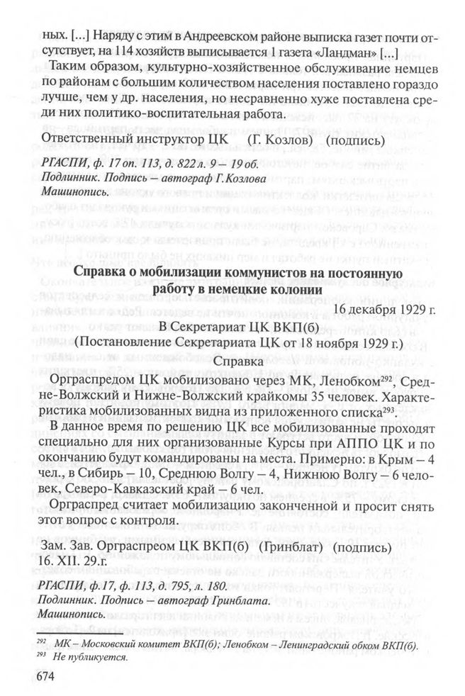 Справка о мобилизации коммунистов на постоянную работу в немецкие колонии. 16 декабря 1929 г. // РГАСПИ. Ф.17. Ф. 113. Д. 795. Л. 180. Подлинник. Подпись - автограф Гринблата. Машинопись.