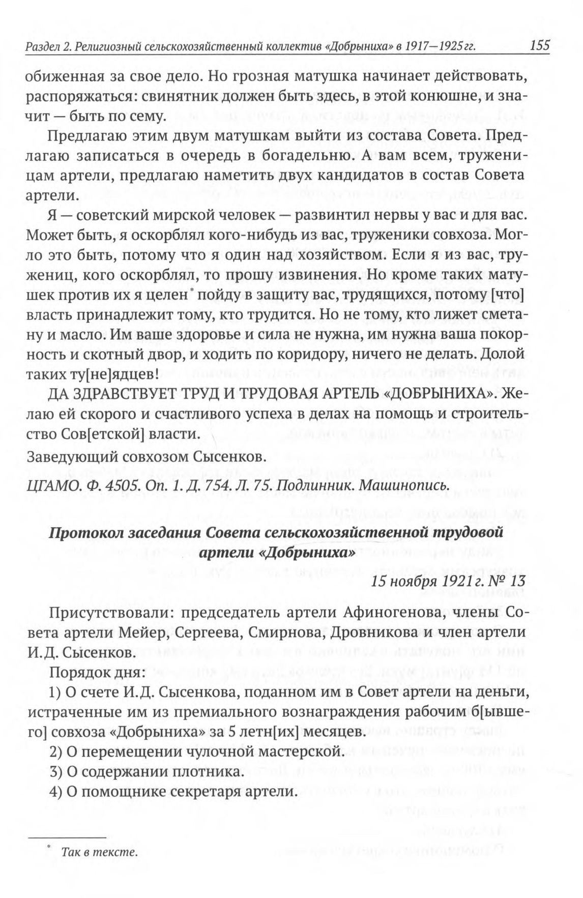 Протокол заседания Совета сельскохозяйственной трудовой артели «Добрыниха». 15 ноября 1921 г. // ЦГАМО. Ф. 4505. Oп. 1. Д. 754. Л. 90—90 об. Заверенная копия. Протокол за № 13. Рукопись.