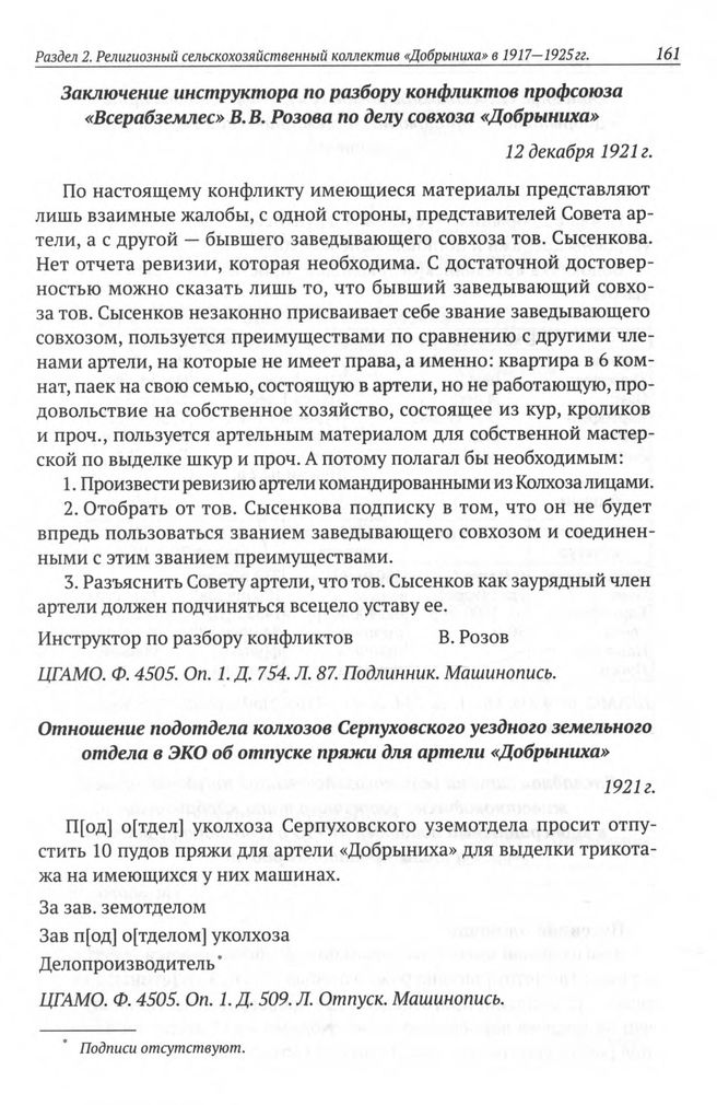 Заключение инструктора по разбору конфликтов профсоюза «Всерабземлес» В. В. Розова по делу совхоза «Добрыниха». 12 декабря 1921 г. // ЦГАМО. Ф. 4505. Oп. 1. Д. 754. Л. 87. Подлинник. Машинопись.