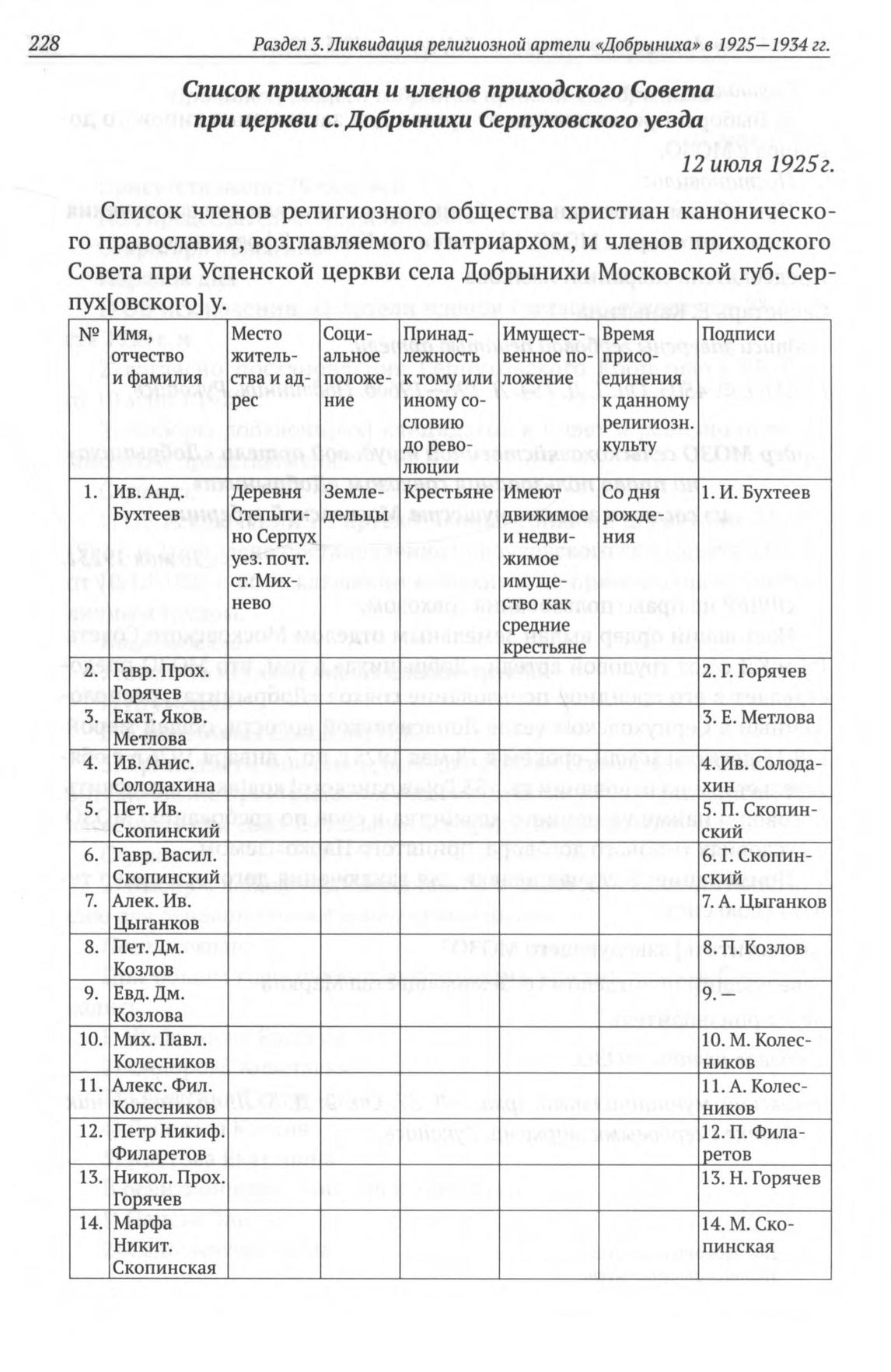 Список прихожан и членов приходского Совета при церкви с. Добрынихи Серпуховского уезда. 12 июля 1925 г. // ЦГАМО. Ф. 2458. Oп. 1. Д. 14. Л. 4—13. Подлинник. Рукопись.