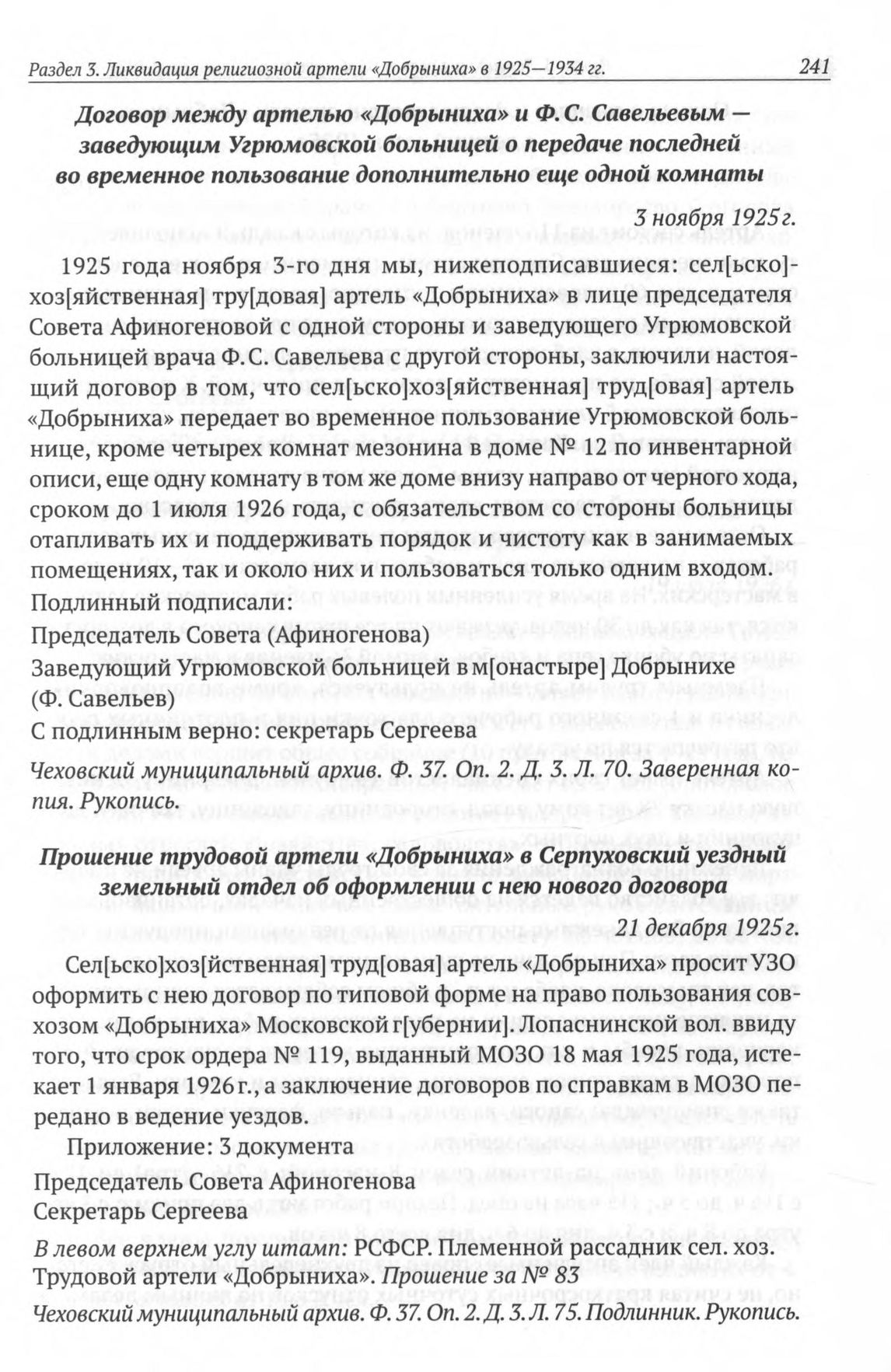 Договор между артелью «Добрыниха» и Ф. С. Савельевым — заведующим Угрюмовской больницей о передаче последней во временное пользование дополнительно еще одной комнаты. 3 ноября 1925 г. // Чеховский муниципальный архив. Ф. 37. Oп. 2. Д. 3. Л. 70. Заверенная копия. Рукопись.