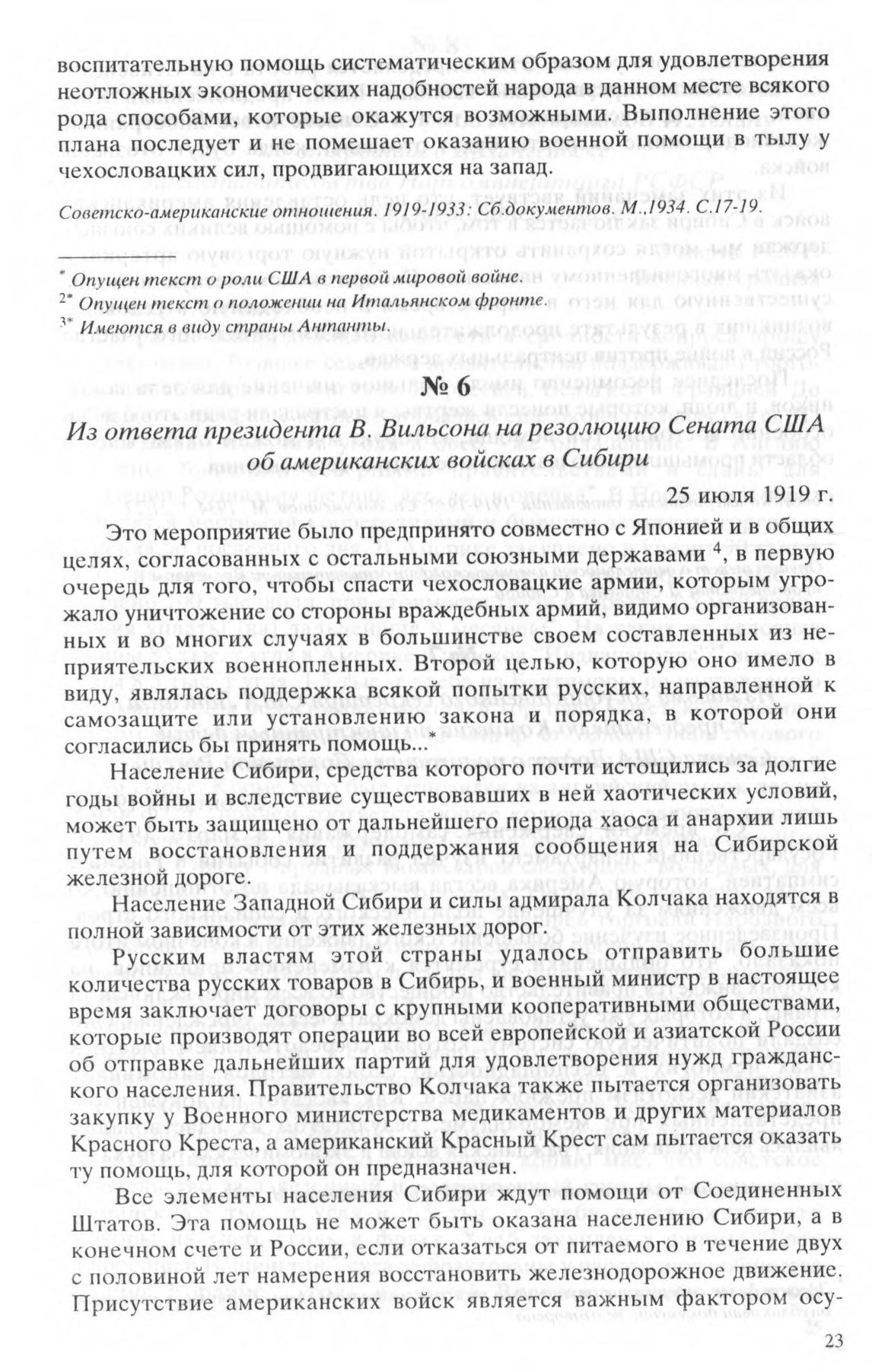 Из ответа президента В. Вильсона на резолюцию Сената США об американских войсках в Сибири. 25 июля 1919 г. // Советско-американские отношения. 1919-1933. Сб. документов. М., 1934. С.21-23.
