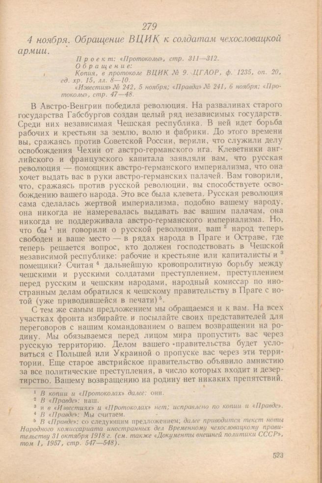 4 ноября. Обращение ВЦИК к солдатам чехословацкой армии // П р о е к т: «Протоколы», стр. 311—312. О б р а щ е н и е: Копия, в протоколе ВЦИК № 9. ЦГАОР, ф. 1235, oп. 20, ед. хр. 15, лл. 8—10. «Известия» № 242, 5 ноября; «Правда» № 241, 6 ноября; «Протоколы», стр. 47—48.