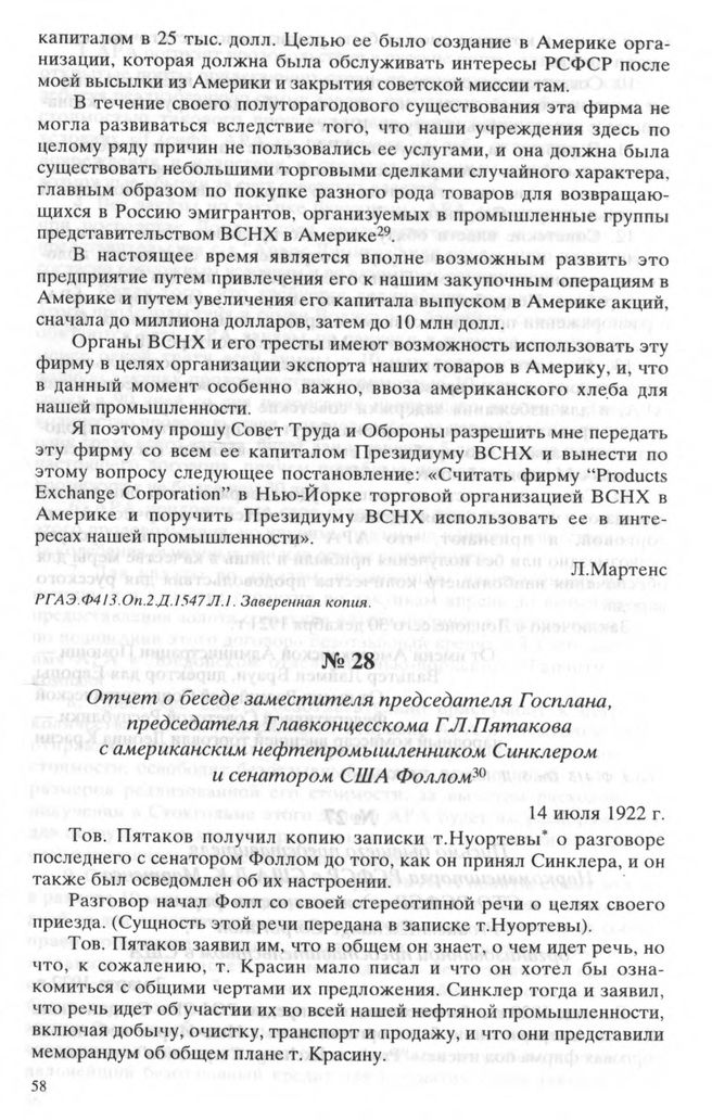 Отчет о беседе заместителя председателя Госплана, председателя Главконцесскома Г.Л. Пятакова с американским нефтепромышленником Синклером и сенатором США Фоллом. 14 июля 1922 г. // РГАЭ. Ф.413 . Оп.2. Д.1684. Л.38-36. Подлинник.