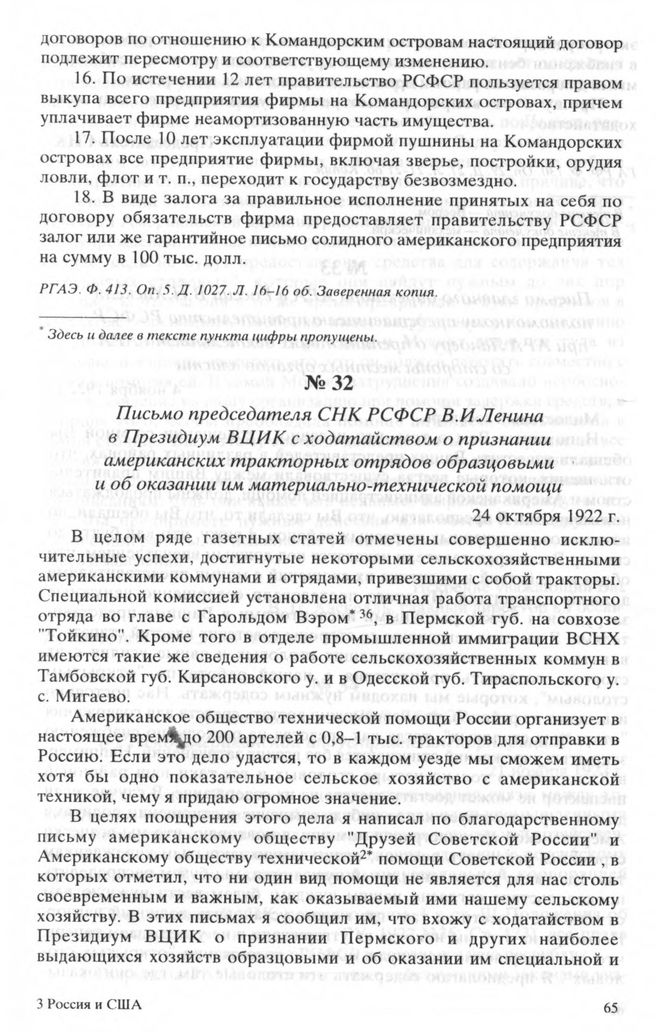 Письмо председателя СНК РСФСР В.И. Ленина в Президиум ВЦИК с ходатайством о признании американских тракторных отрядов образцовыми и об оказании им материально-технической помощи. 24 октября 1922 г. // ГА РФ. Ф. 130. Oп. 27. Д. 21. Л. 21-21 об. Копия.