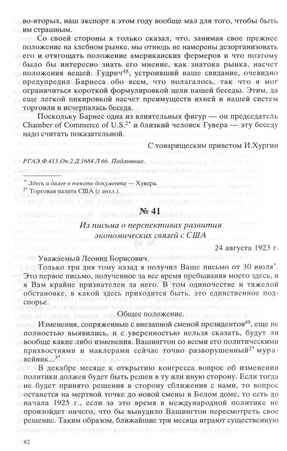Письма представителя Наркомвнешторга СССР в США И.Я.Хургина наркому внешней торговли Л.Б.Красину. Из письма о перспективах развития экономических связей с США. 24 августа 1923 г. // РГАЭ. Ф.413. Оп.2. Д.1684. Л. 126-120. Подлинник.