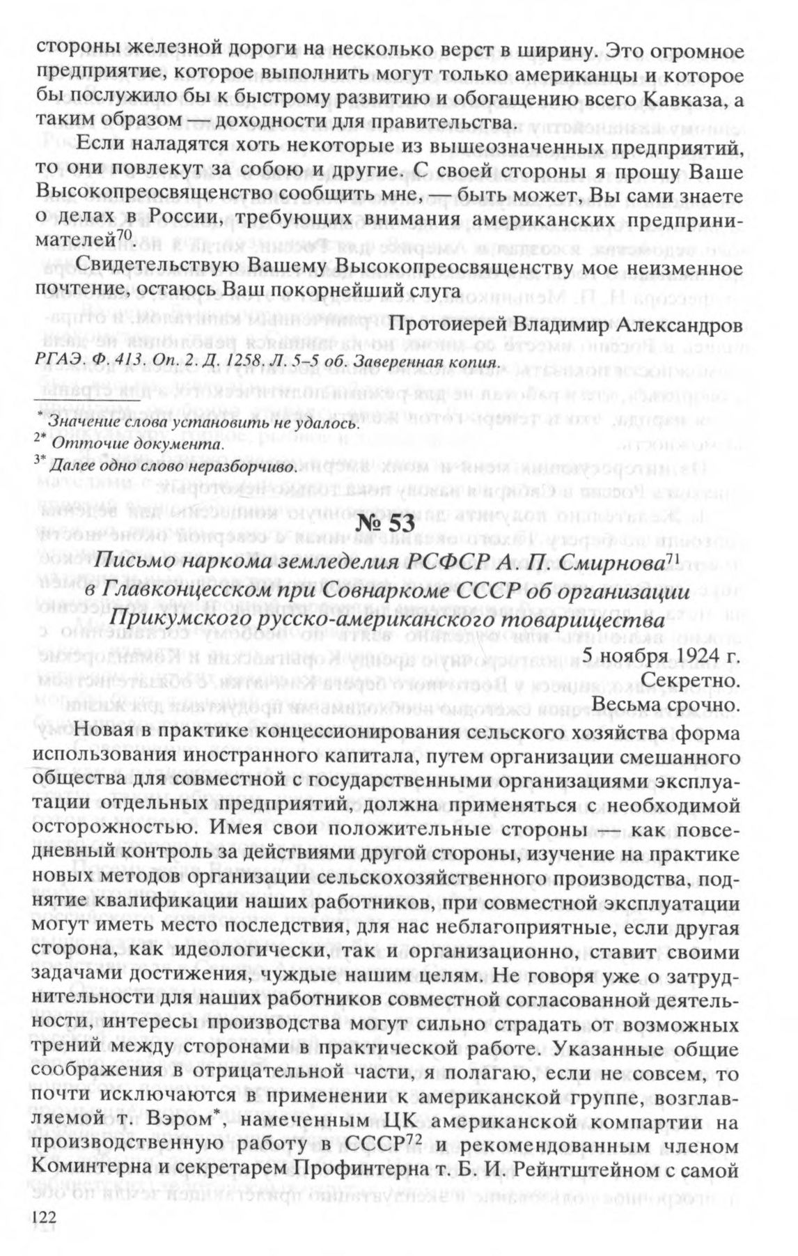 Письмо наркома земледелия РСФСР А. П. Смирнова в Главконцесском при Совнаркоме СССР об организации Прикумского русско-американского товарищества. 5 ноября 1924 г. // РГАЭ. Ф. 478. Oп. 2. Д. 928. Л. 9-9 об. Копия.