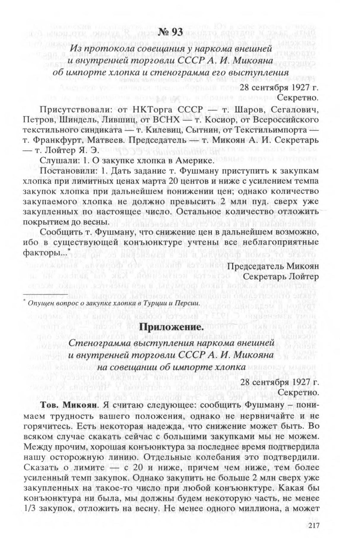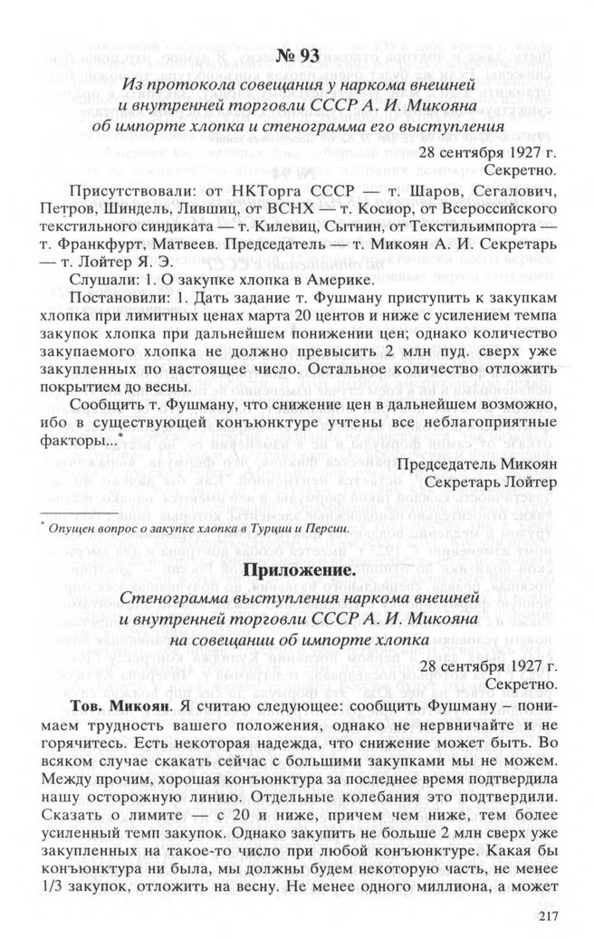 Из протокола совещания у наркома внешней и внутренней торговли СССР А. И. Микояна об импорте хлопка и стенограмма его выступления. 28 сентября 1927 г. // РГАЭ. Ф. 5240. Oп. 18. Д. 166. Л. 62, 64. Заверенная копия.