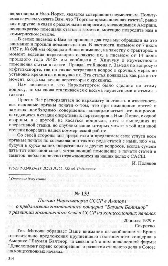 Письмо Наркомторга СССР в Амторг о предложении гостиничного концерна “Бауман Балтмор” о развитии гостиничного дела в СССР на концессионных началах. 20 июля 1929 г. // РГАЭ Ф.5240.Оп.18. Д.243Л.118. Копия.