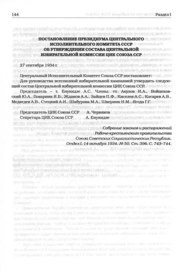 Постановление Президиума ЦИК СССР «Об утверждении состава Центральной избирательной комиссии ЦИК Союза ССР» (27 сентября 1934 г.) // Собрание законов и распоряжений Рабоче-крестьянского правительства Союза Советских Социалистических Республик. Отдел 1. 14 октября 1934. № 50. Cт 396. С. 743-744.
