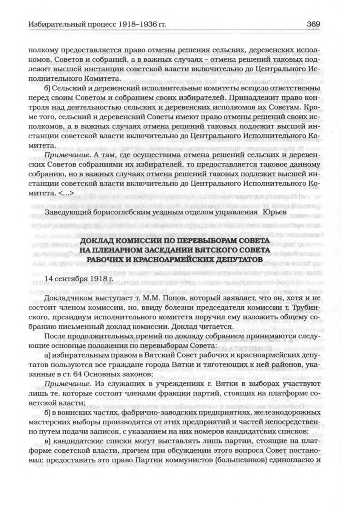 Доклад комиссии по перевыборам Совета на пленарном заседании Вятского Совета рабочих и красноармейских депутатов. (14 сентября 1918 г.) // Советы в эпоху военного коммунизма: Сб. документов. Ч. II / Под ред. и с предисл. В.П. Антонова-Саратовского. М., 1929. С. 195-211, 220-232, 234-236.