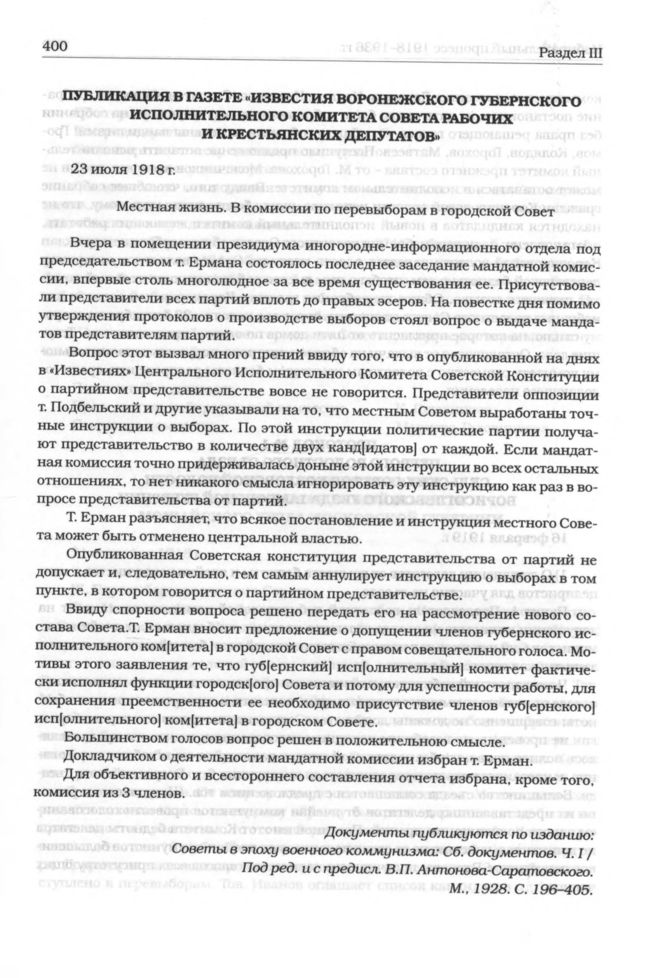 Публикация в газете «Известия Воронежского губернского исполнительного комитета Совета рабочих и крестьянских депутатов» (23 июля 1918 г.) // Советы в эпоху военного коммунизма: Сб. документов. Ч. I / Под ред. и с предисл. В.П. Антонова-Саратовского. М., 1928. С. 196-405.