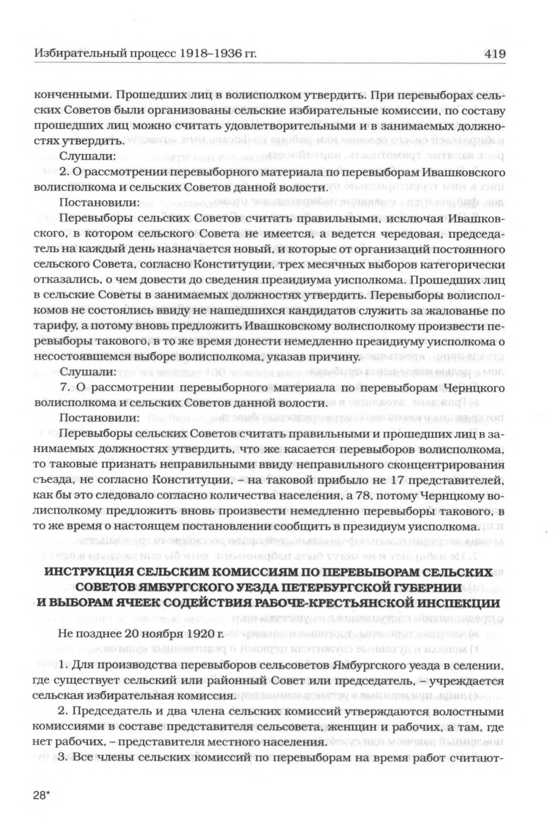 Инструкция сельским комиссиям по перевыборам сельских Советов Ямбургского уезда Петербургской губернии и выборам ячеек содействия рабоче-крестьянской инспекции (не позднее 20 ноября 1920 г.) // Советы в эпоху военного коммунизма: Сб. документов. Ч. II / Под ред. и с предисл. В.П. Антонова-Саратовского. М., 1929. С. 195-211, 220-232, 234-236.