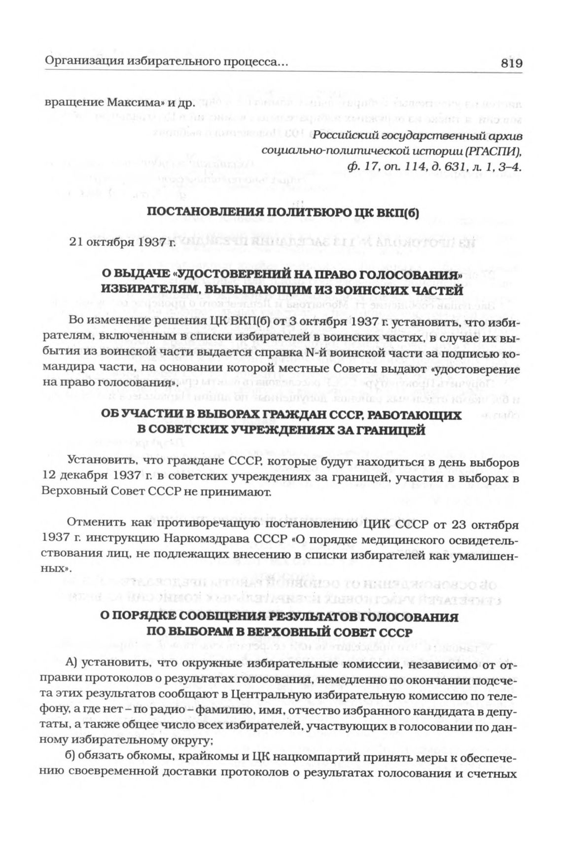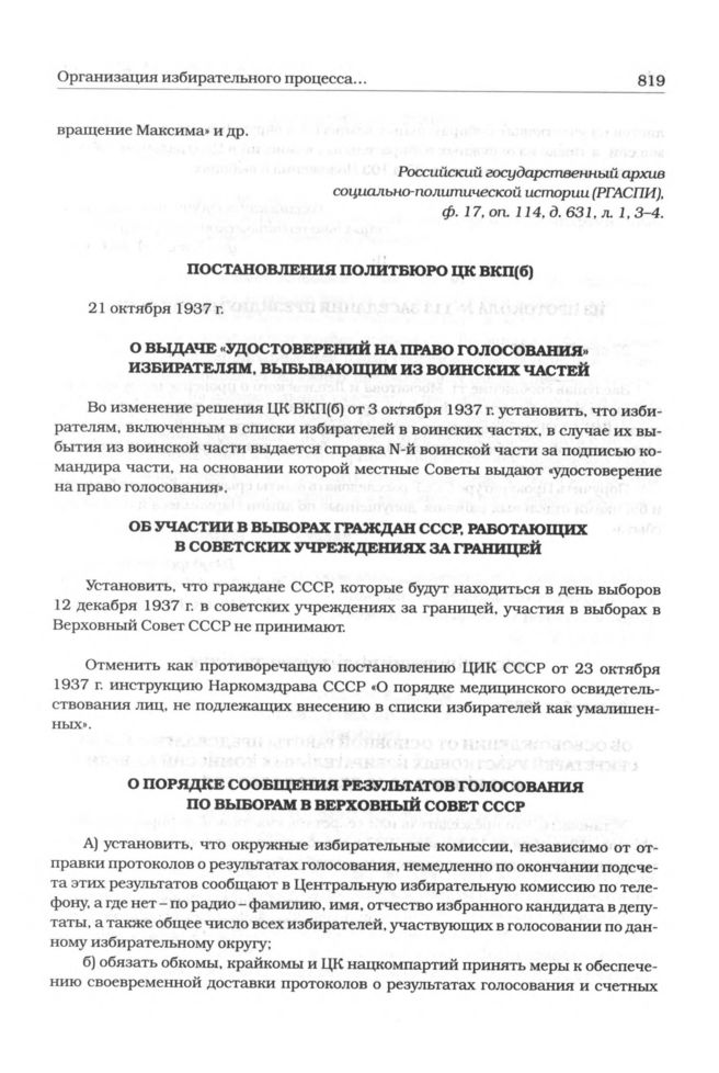 Постановление Политбюро ЦК ВКП(б). 21 октября 1937 г. «Об участии в выборах граждан СССР, работающих в советских учреждениях за границей» // Российский государственный архив социально-политической истории (РГАСПИ), Ф. 17, Оп. 3, Д. 993, Л. 55.