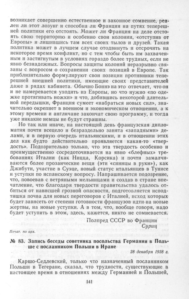 Запись беседы советника посольства Германии в Польше с посланником Польши в Иране. 28 декабря 1938 г. // Печат. по арх.