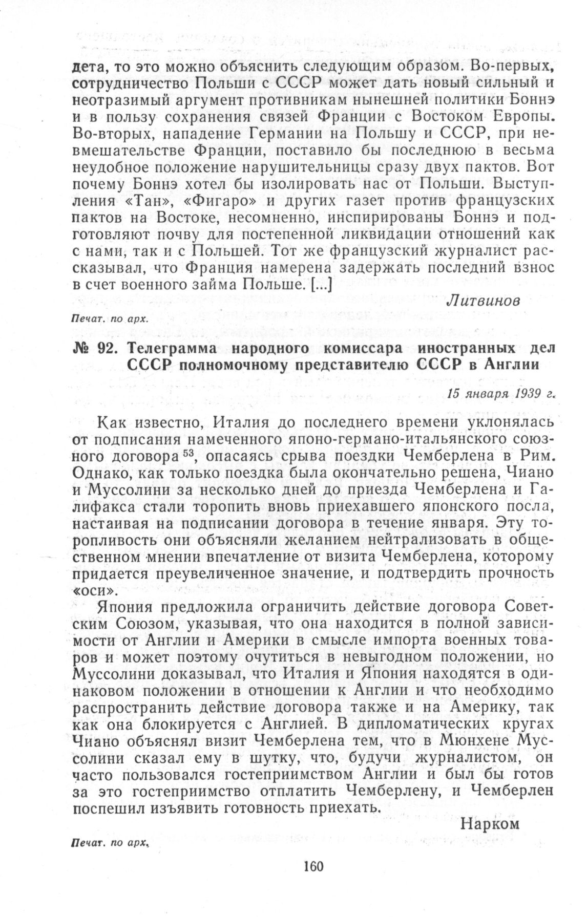 Телеграмма народного комиссара иностранных дел СССР полномочному представителю СССР в Англии. 15 января 1939 г. // Печат. по арх.