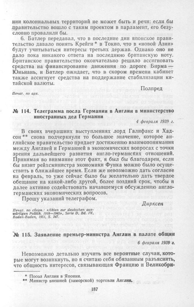 Заявление премьер-министра Англии в палате общин. 6 февраля 1939 г. // Печат. по сборн.: «Documents on British Foreign Policy. 1919—1939», Third series, vol. IV. London, 1951, p. 90.