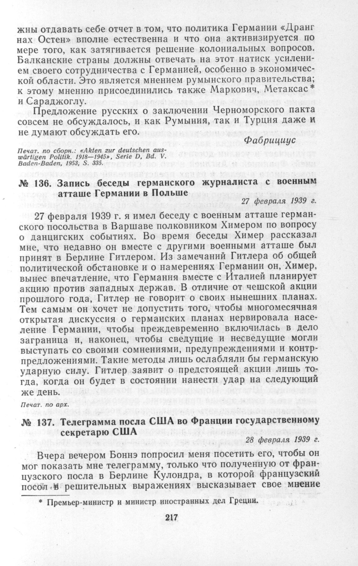 Телеграмма посла США во Франции государственному секретарю США. 28 февраля 1939 г. // Печат. по сборн.: «Foreign Relations of the United States Diplomatic Papers. 1939», vol. I. Washington, 1956, p. 25-26.