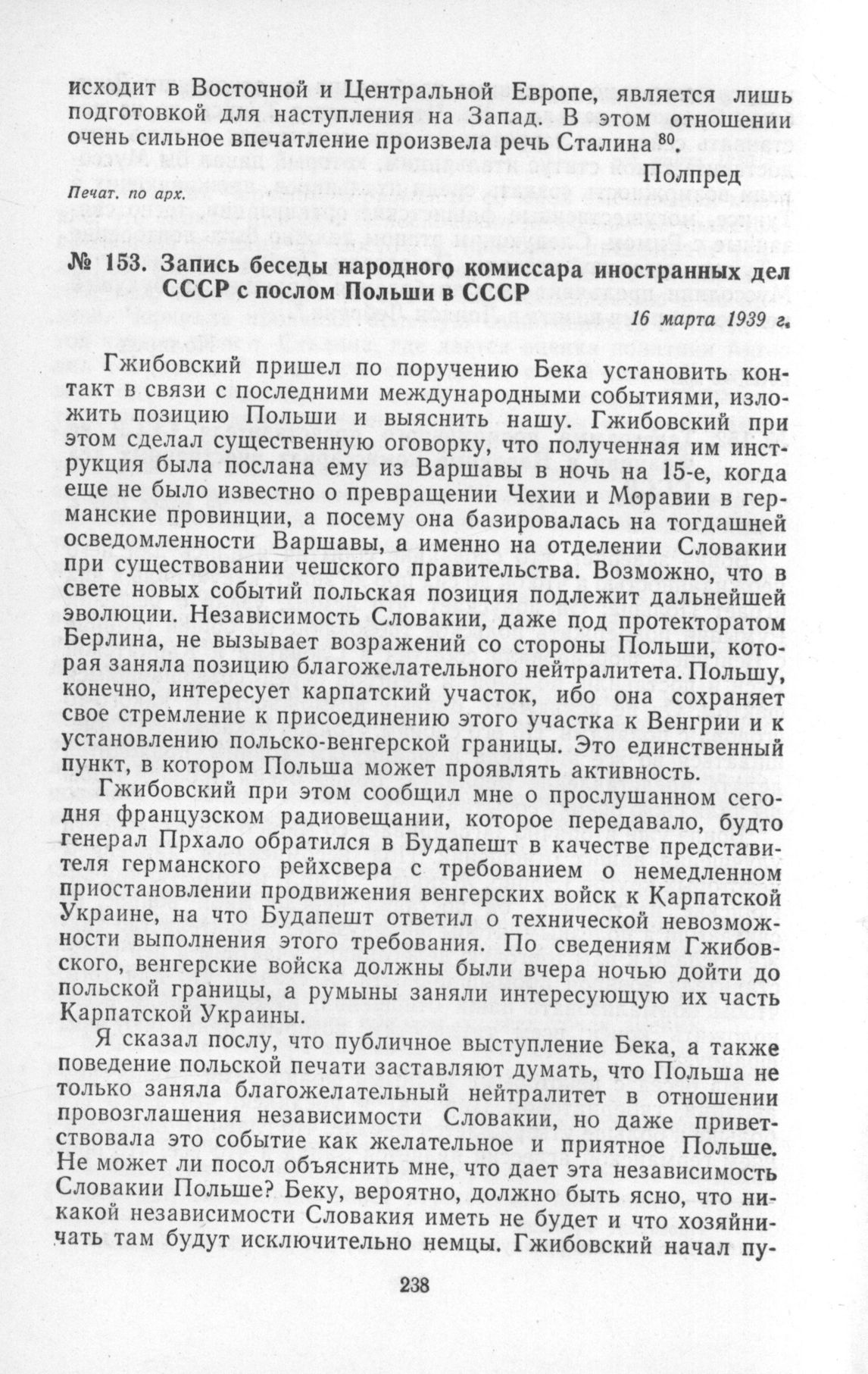Запись беседы народного комиссара иностранных дел СССР с послом Польши в СССР. 16 марта 1939 г. // Печат. по арх.