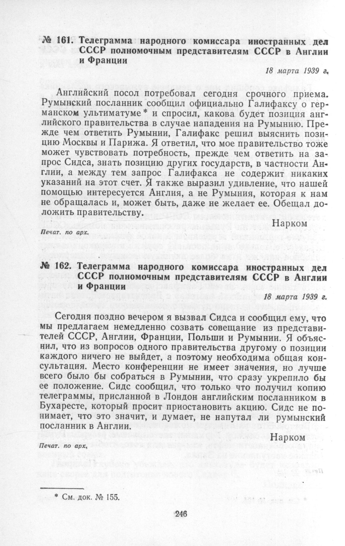 Телеграмма народного комиссара иностранных дел СССР полномочным представителям СССР в Англии и Франции. 18 марта 1939 г. // Печат. по арх.