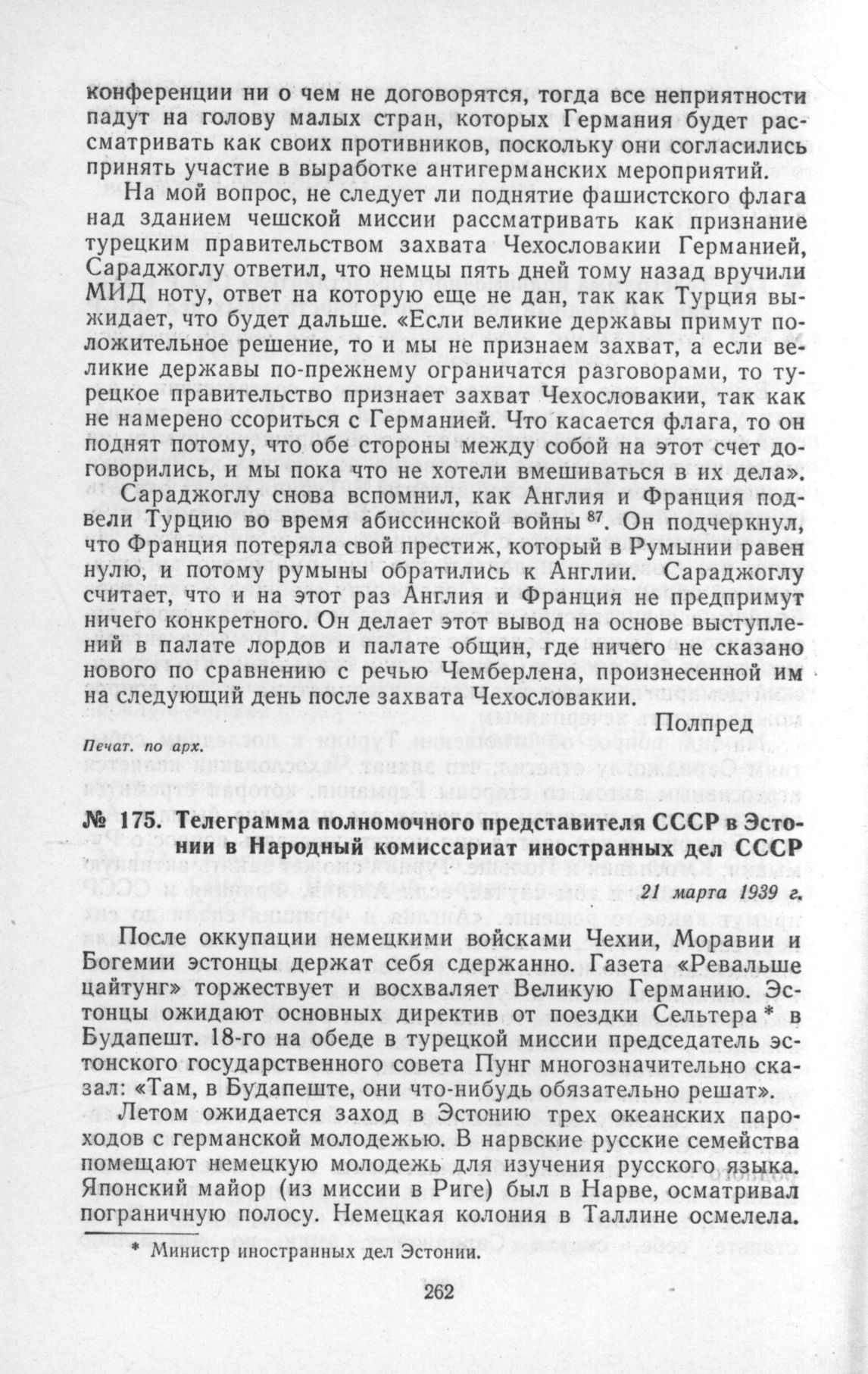 Телеграмма полномочного представителя СССР в Эстонии в Народный комиссариат иностранных дел СССР. 21 марта 1939 г. // Печат. по арх.