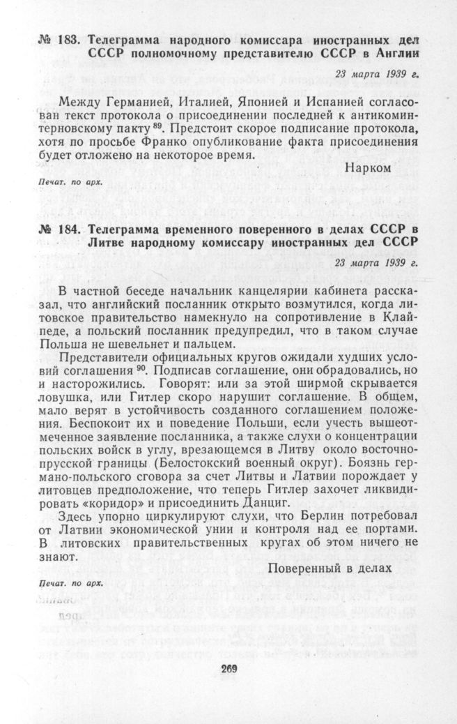 Телеграмма народного комиссара иностранных дел СССР полномочному представителю СССР в Англии. 23 марта 1939 г. // Печат. по арх.