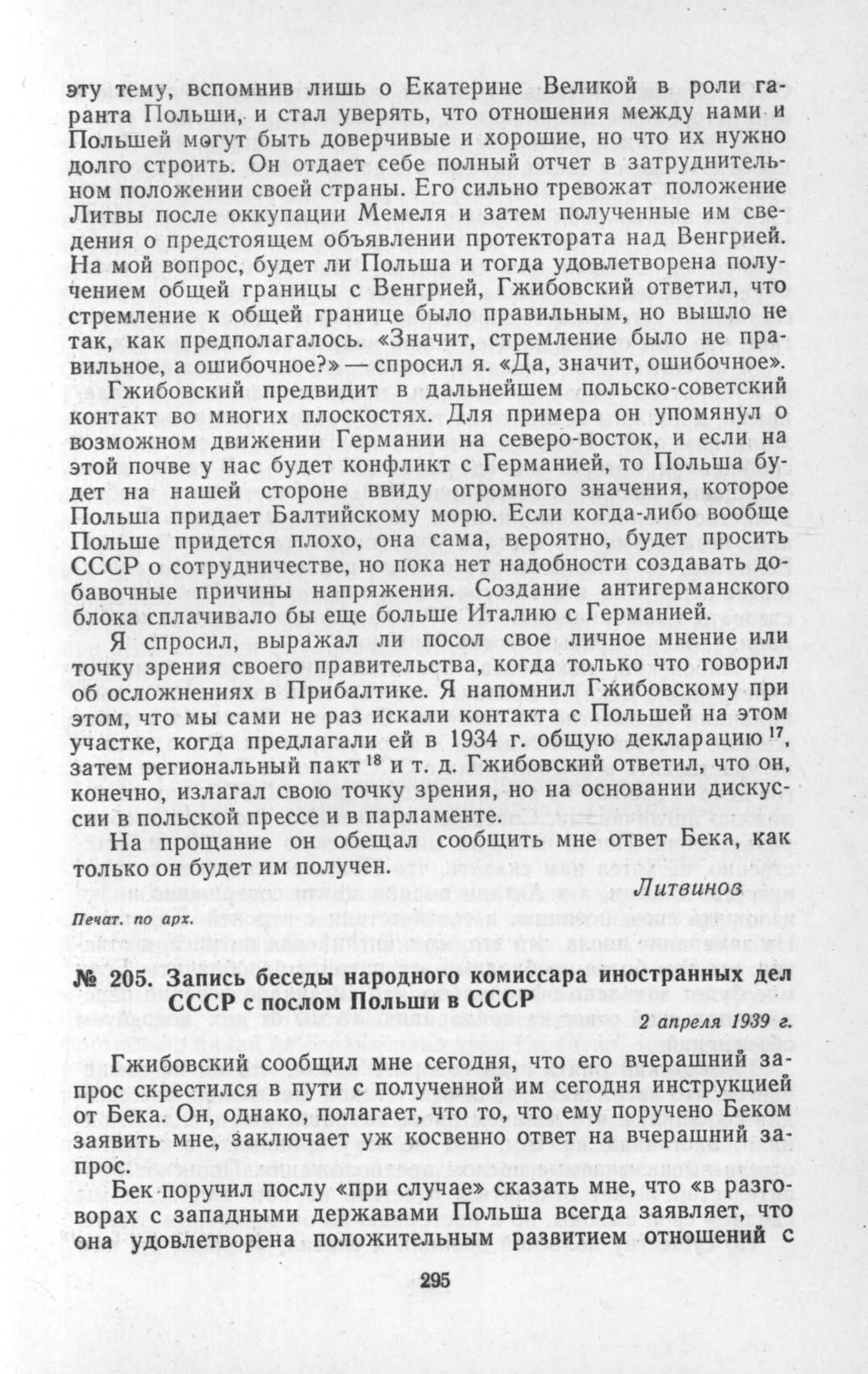Запись беседы народного комиссара иностранных дел СССР с послом Польши в СССР. 2 апреля 1939 г. // Печат. по арх.