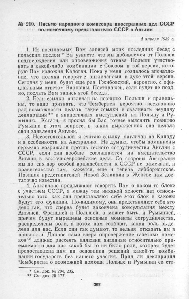 Письмо народного комиссара иностранных дел СССР полномочному представителю СССР в Англии. 4 апреля 1939 г. // Печат. по арх.