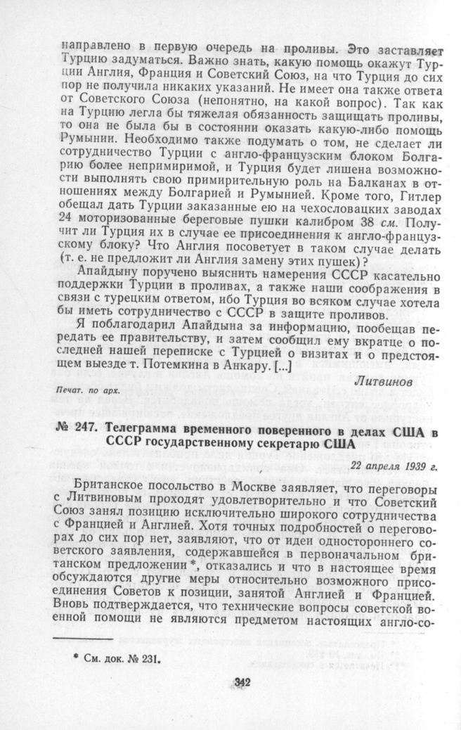 Телеграмма временного поверенного в делах США в СССР государственному секретарю США. 22 апреля 1939 г. // Печат. по сборн.: «Foreign Relations of the United States. Diplomatic Papers. 1939», vol. I. Washington, 1956, p. 240.