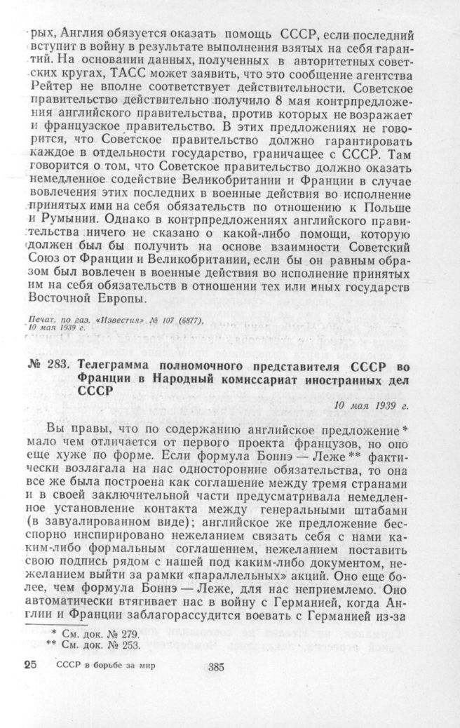 Телеграмма полномочного представителя СССР во Франции в Народный комиссариат иностранных дел СССР. 10 мая 1939 г. // Печат. по арх.