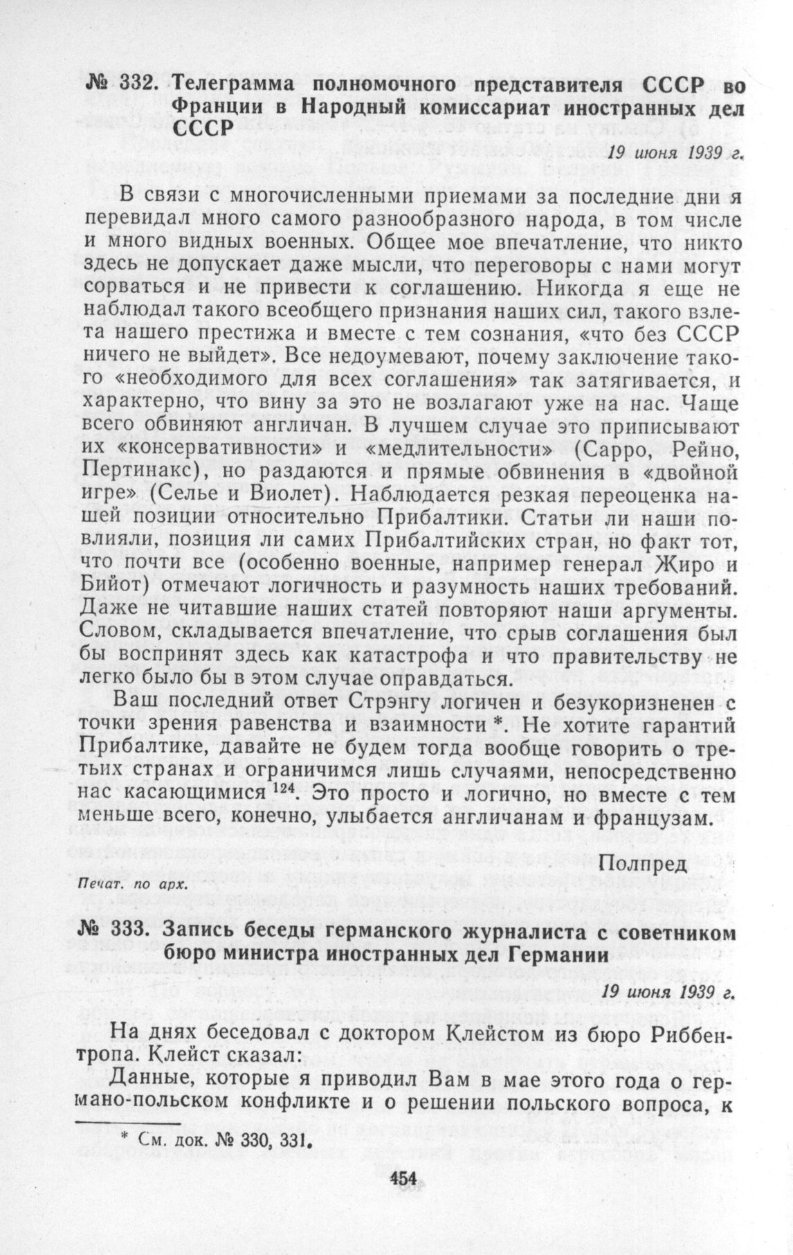 Запись беседы германского журналиста с советником бюро министра иностранных дел Германии. 19 июня 1939 г. // Печат. по арх.