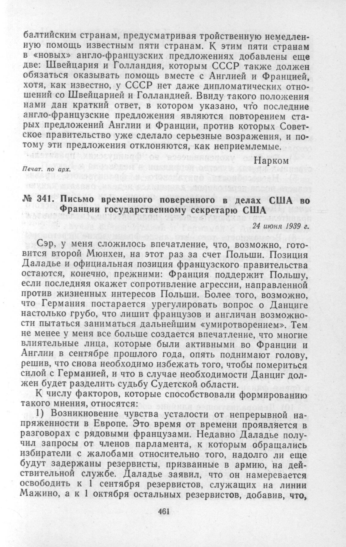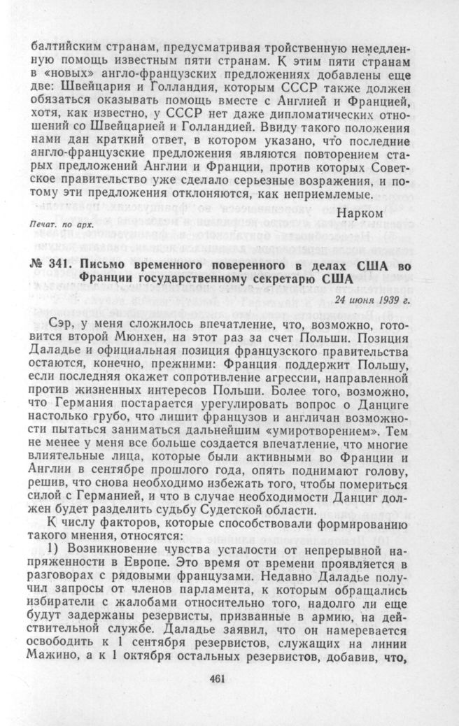 Письмо временного поверенного в делах США во Франции государственному секретарю США. 24 июня 1939 г. // Печат. по сборн.: «Foreign Relations of the United States. Diplomatic Papers. 1939», vol. I. Washington, 1956, p. 193-194.