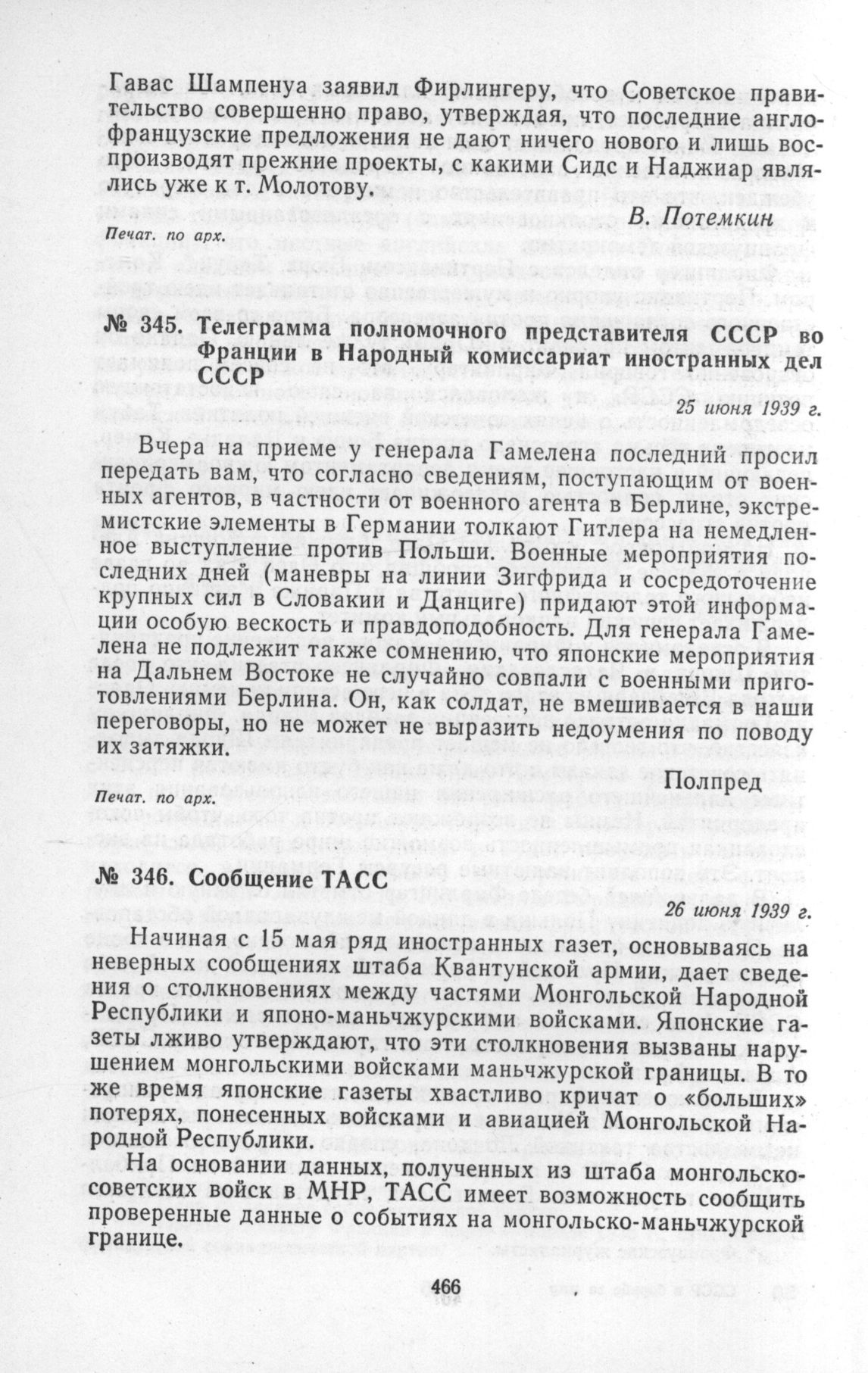 Телеграмма полномочного представителя СССР во Франции в Народный комиссариат иностранных дел СССР. 25 июня 1939 г. // Печат. по арх.