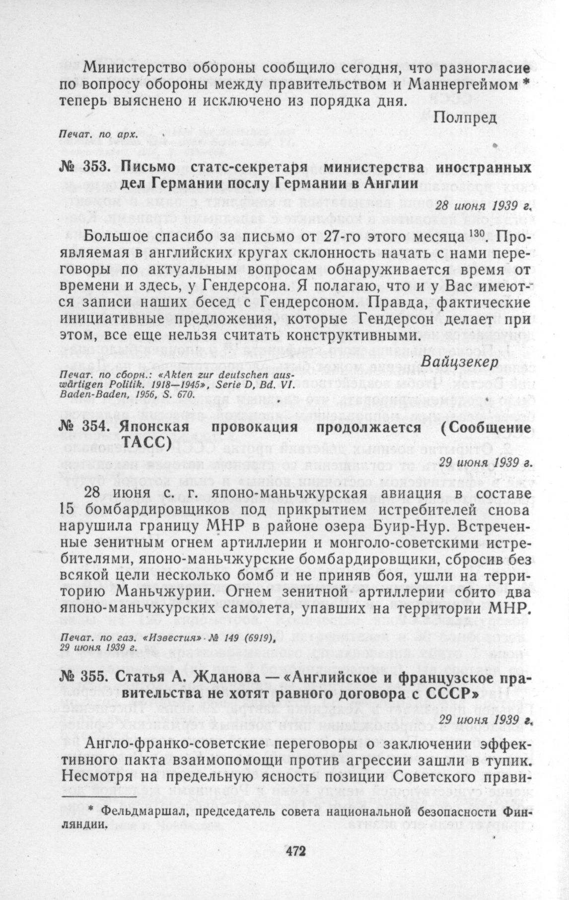 Письмо статс-секретаря министерства иностранных дел Германии послу Германии в Англии. 28 июня 1939 г. // Печат. по сборн.: «Akten zur deutschen auswartigen Politik. 1918-1945». Serie D, Bd. VI. Baden-Baden, 1956, S. 670.
