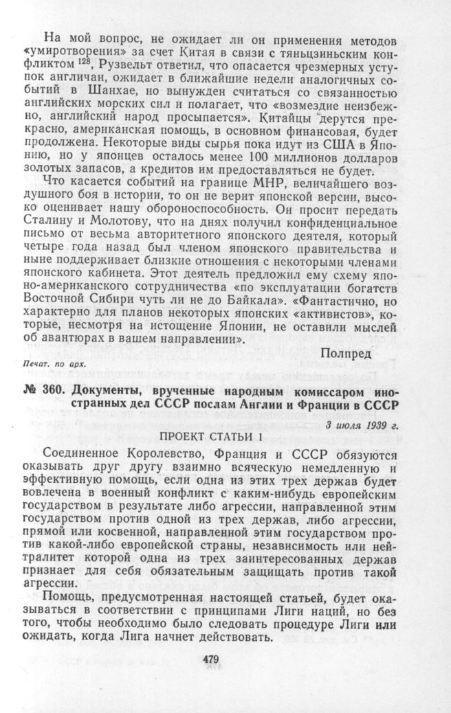 Документы, врученные народным комиссаром иностранных дел СССР послам Англии и Франции в СССР. 3 июля 1939 г. // Печат. по арх.